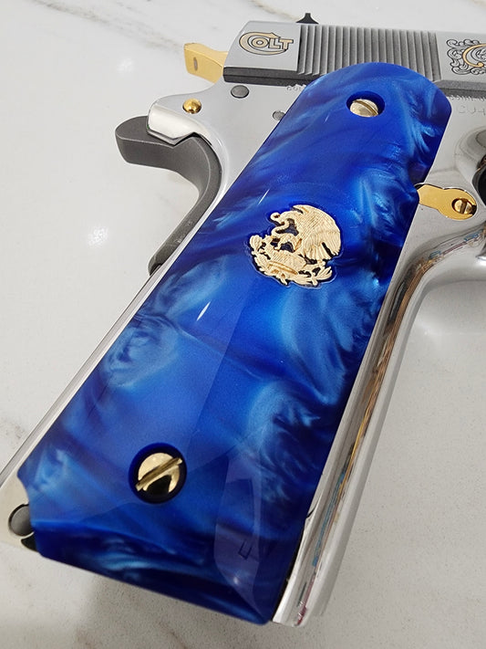 1911 Grips Royal Swirl Blue Pearl with LA Emblem & Mexican Eagle (24k Gold Screws)Regular price $175.00Regular priceUnit price / per-