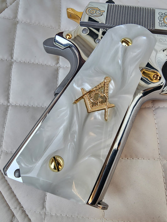 Custom 1911 White Pearl Grips w/ Gold Plated Masonic Emblem & Screws