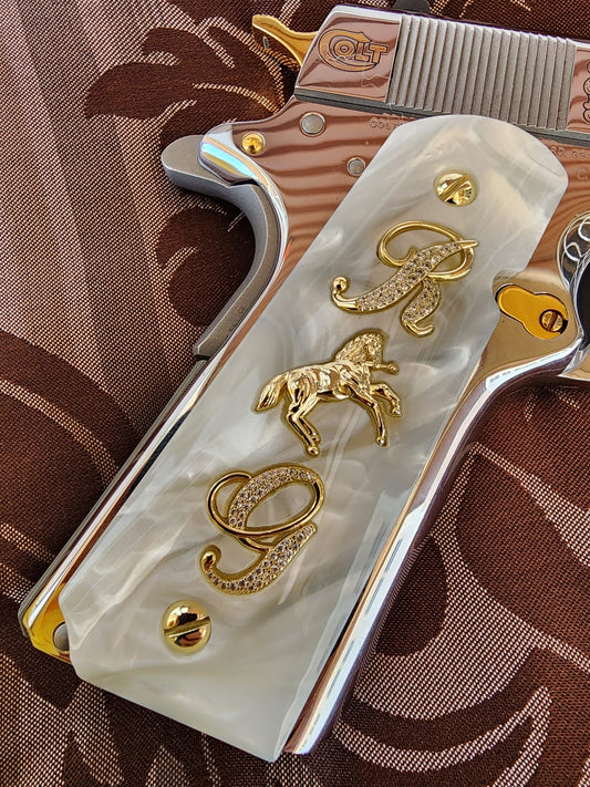 1911 White Pearl Grips Gold “R” & “G” Inlays with Horse Emblem & 24K Gold Plated ScrewsRegular price $199.99Regular priceUnit price / per