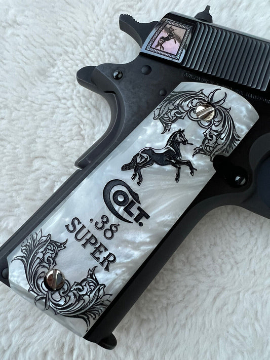 1911 Pearl Colt Horse Logo Engraved Scrolls Grips 45 acp 38 Super calRegular price $140.00Regular priceUnit price / per-