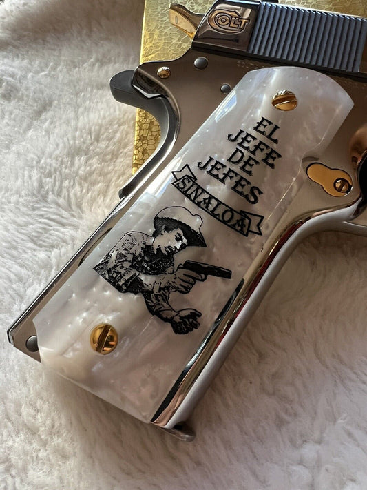 1911 Pearl Laser Engraved Chalino Jefe De Jefes Grips 45 acp 38 Super cal