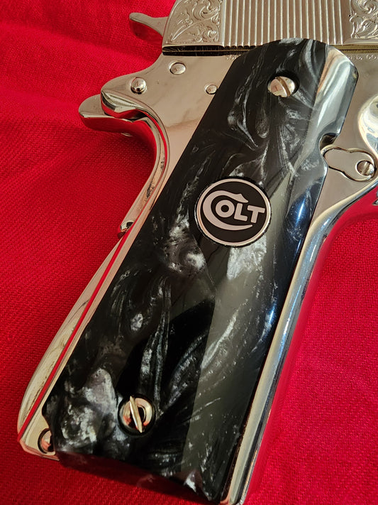 Colt 1911 Black Pearlite Grips Silver Medallion Inlay