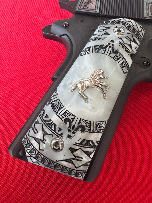 1911 Colt Silver Horse Plated Pearl Aztec Motif Engraved grips 45 38 super Rare