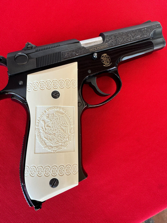 Smith & Wesson 9mm model 39 inlayed Estados Unidos Mexicanos Pistol Grips S&W faux ivory