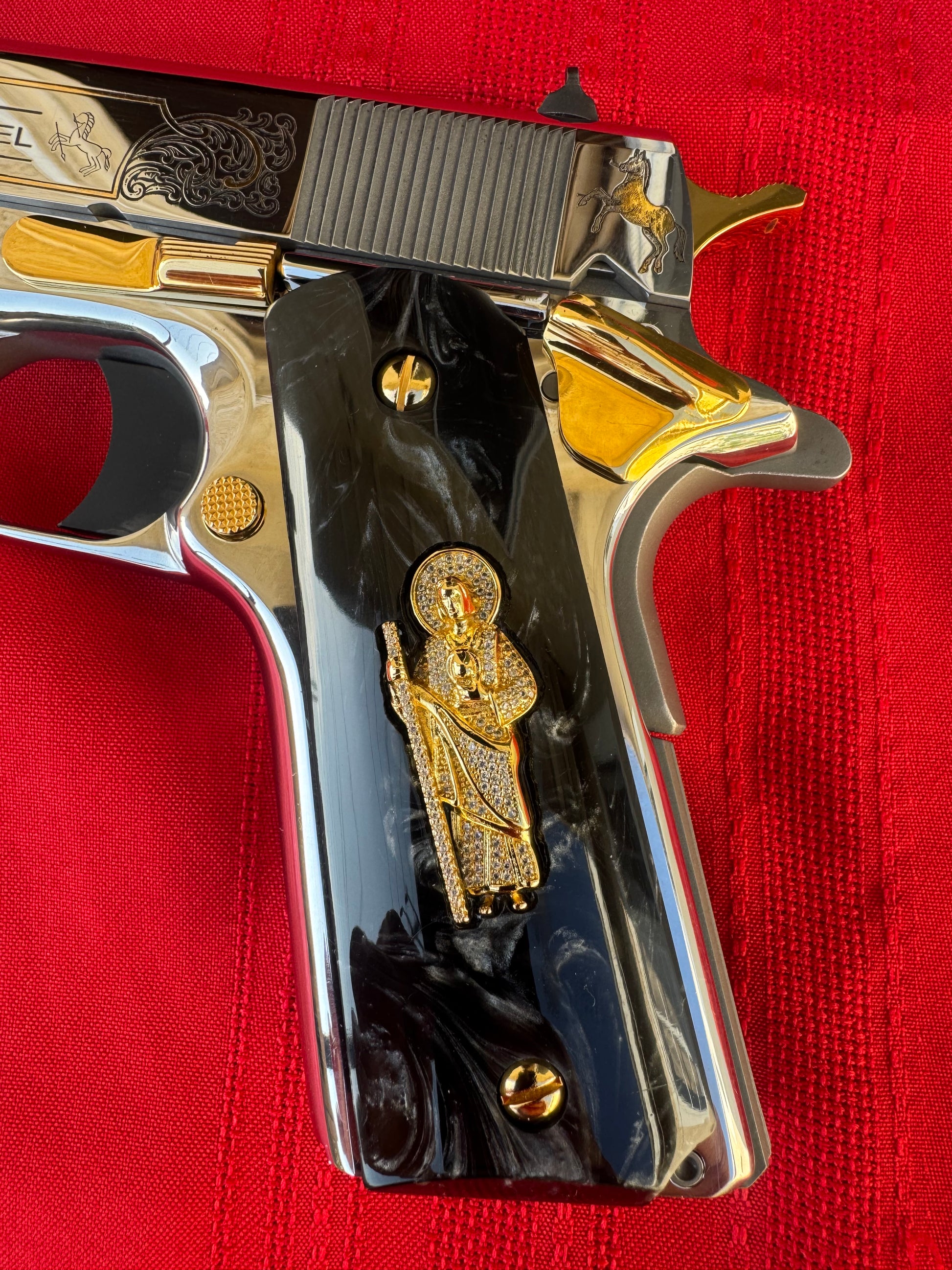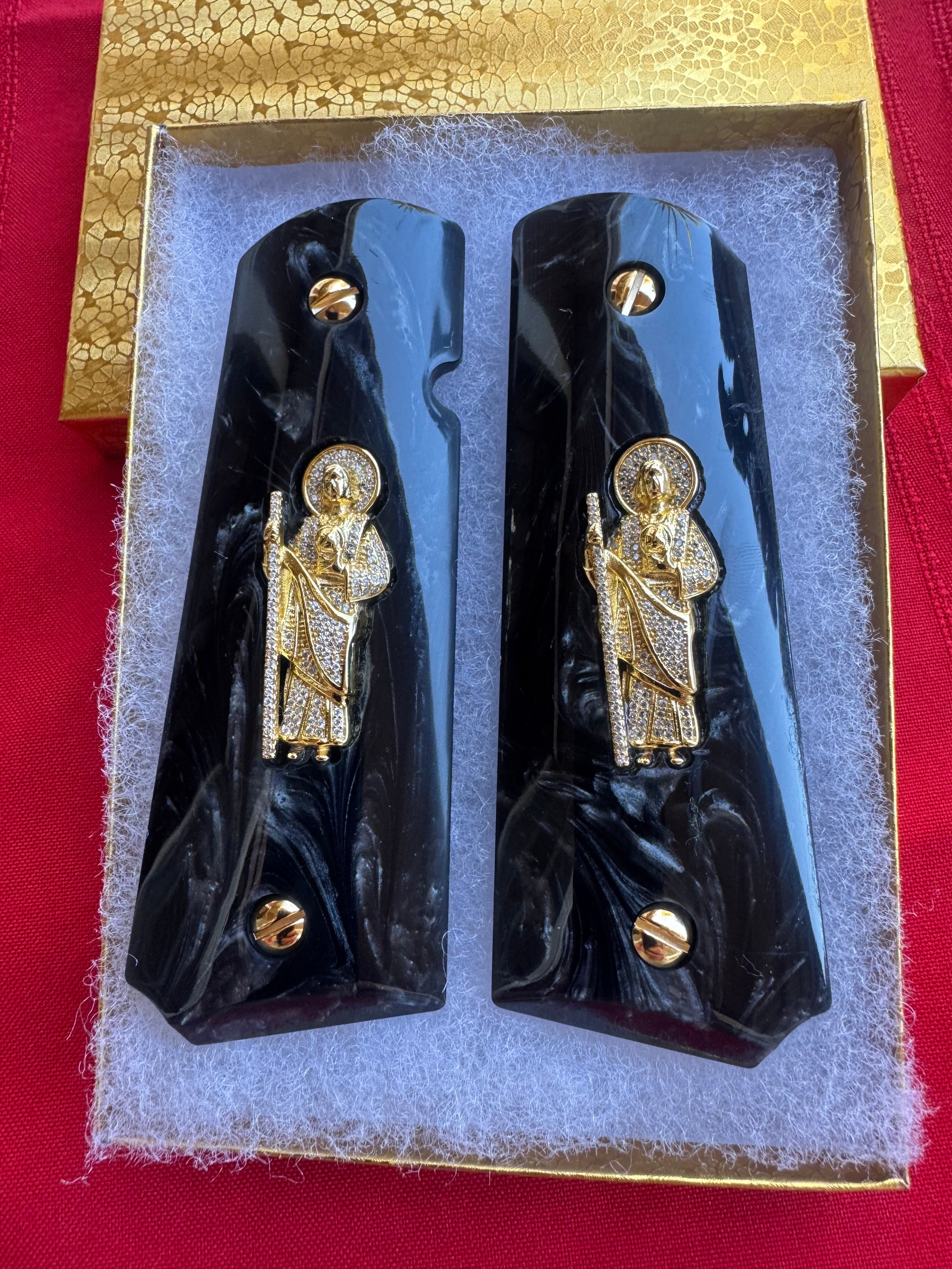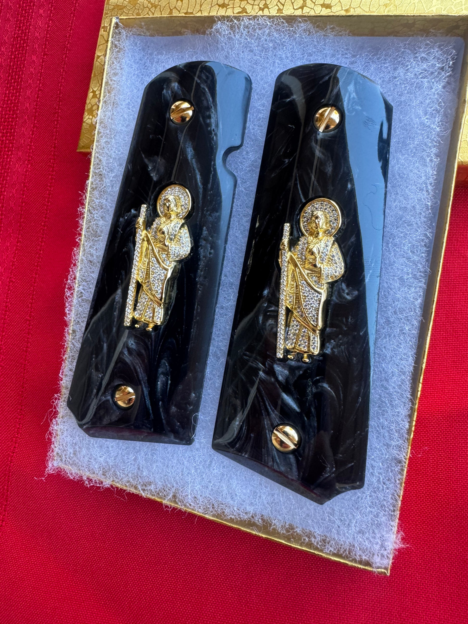 Elevate your 1911 with these elegant and symbolic black pearl grips, featuring finely detailed gold-plated San Judas inlays accented with shimmering CZ stones. This custom set blends deep visual contrast, religious symbolism, and handcrafted luxury—designed for full-size 1911 Government model pistols.