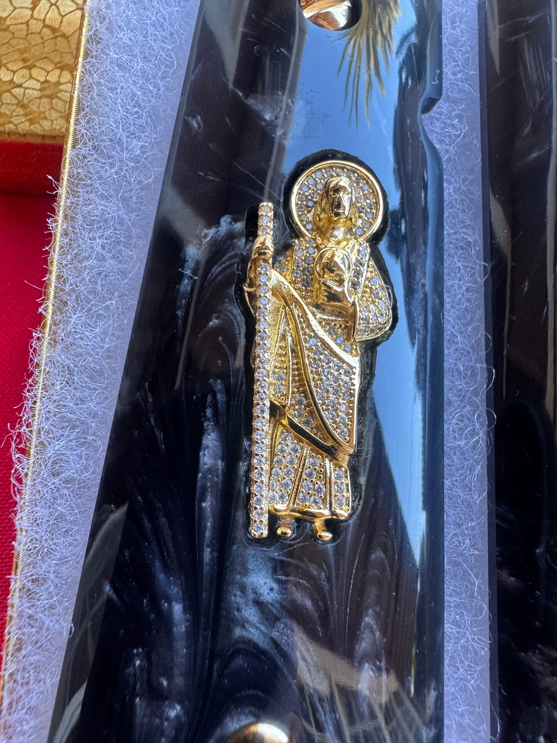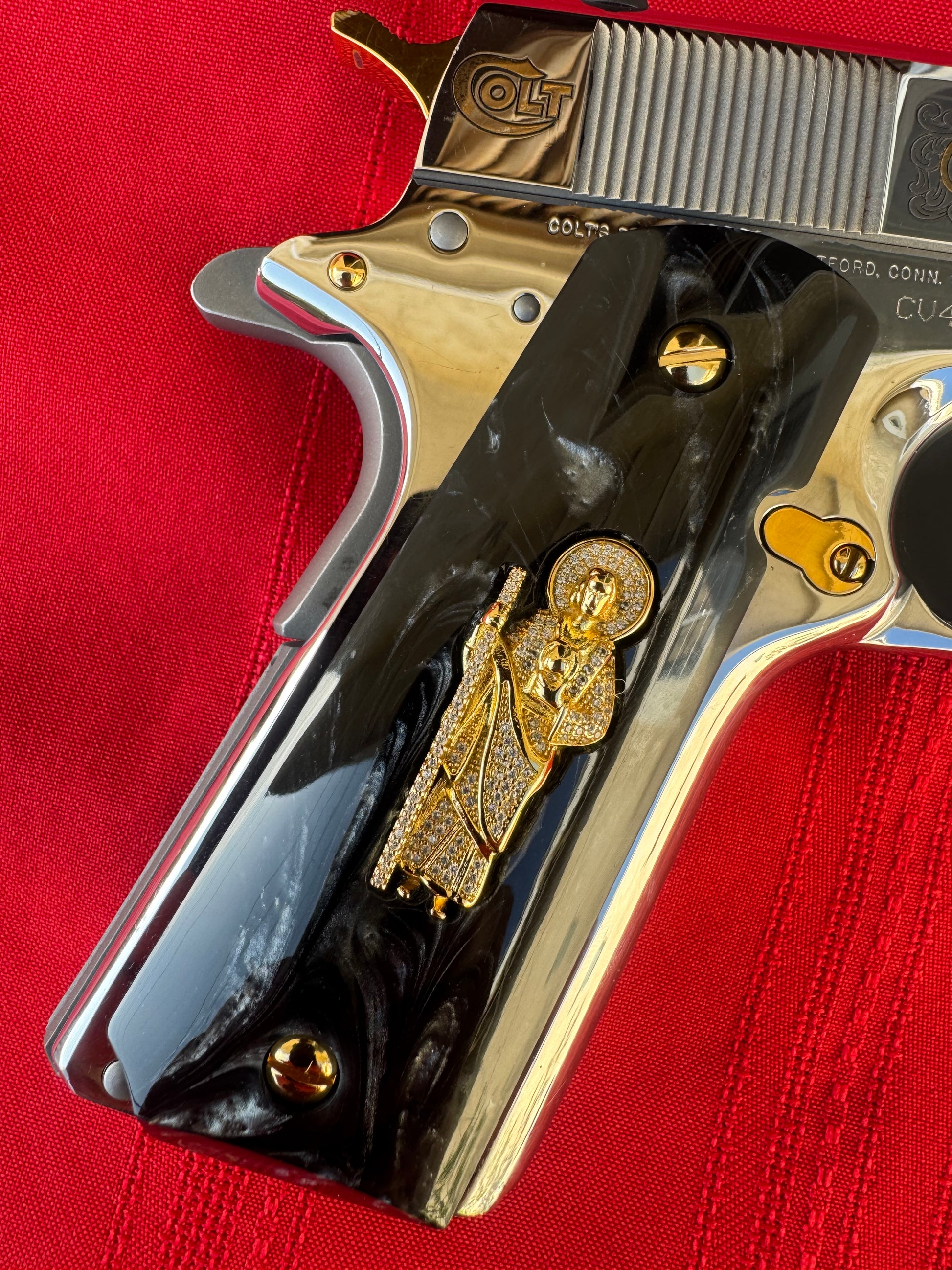 1911 San Judas Inlays with CZ Stones & 24K Gold Plated Screws Black Pearlite Grips