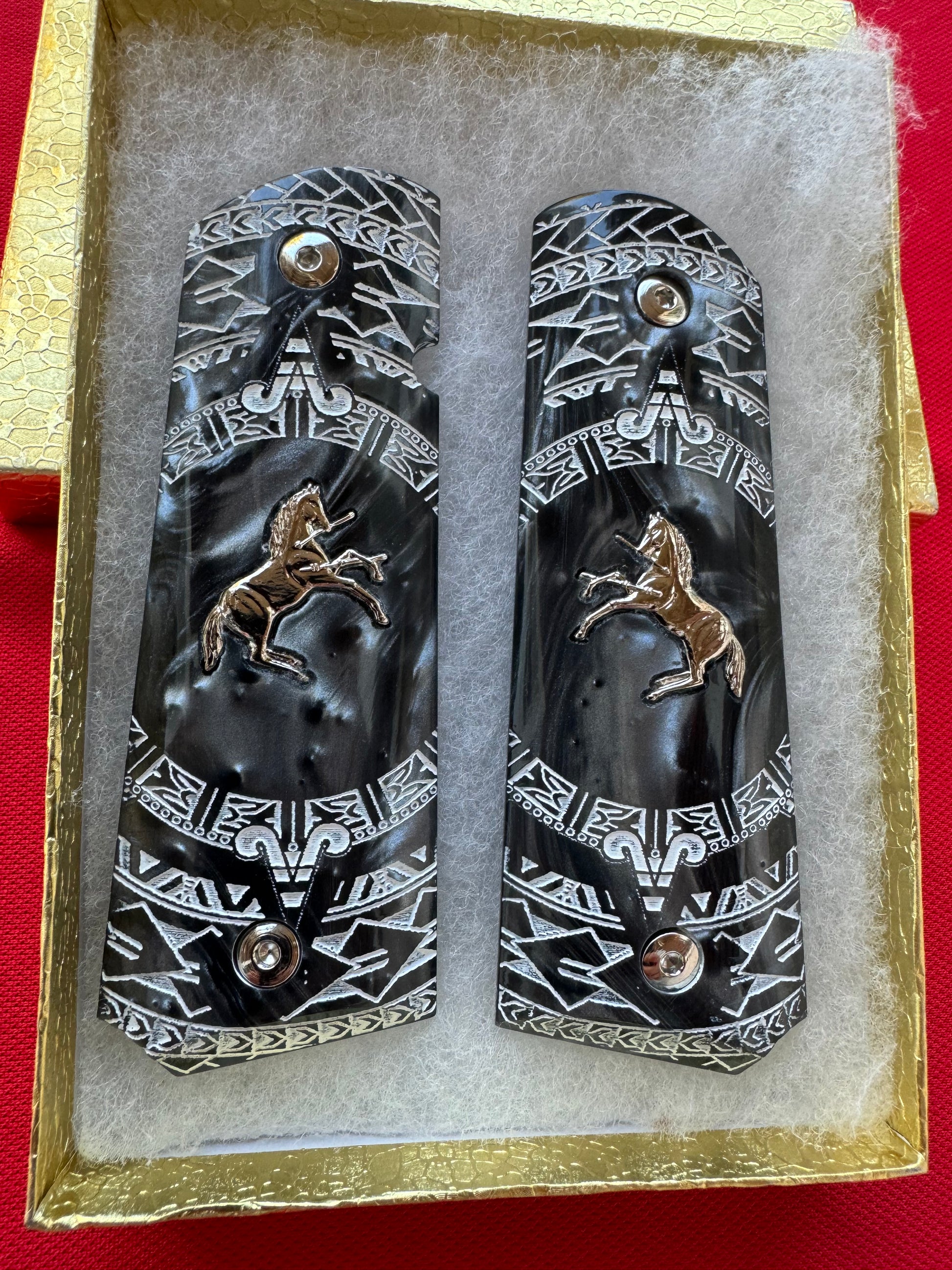 1911 Colt Gold Horse Plated Black Pearl Aztec Motif Engraved grips 45 38 super Rare