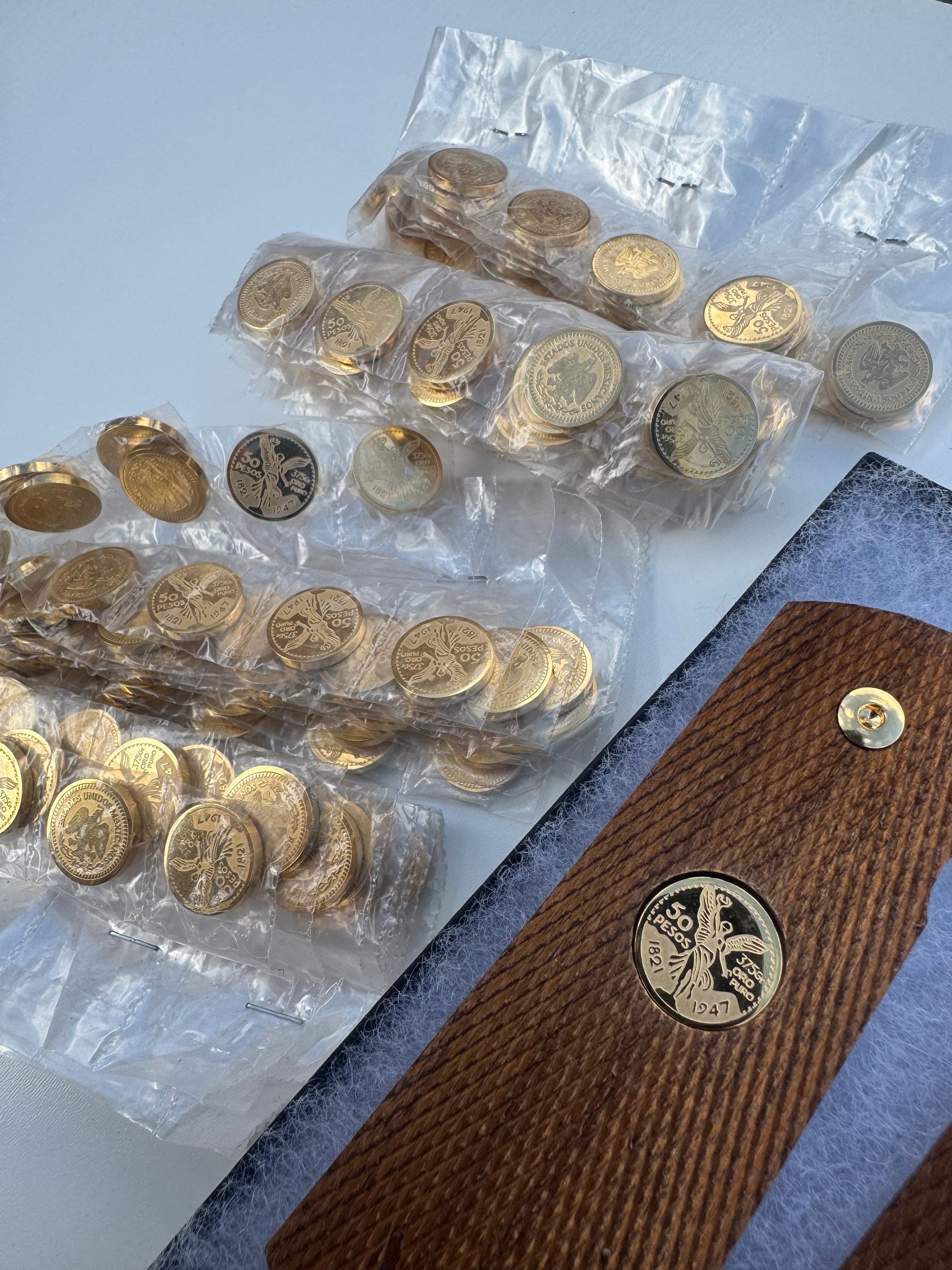 1911 Colt Series 70 Factory Original, Checkered Wood Grips with custom 24k Gold filled Mexican Medallion