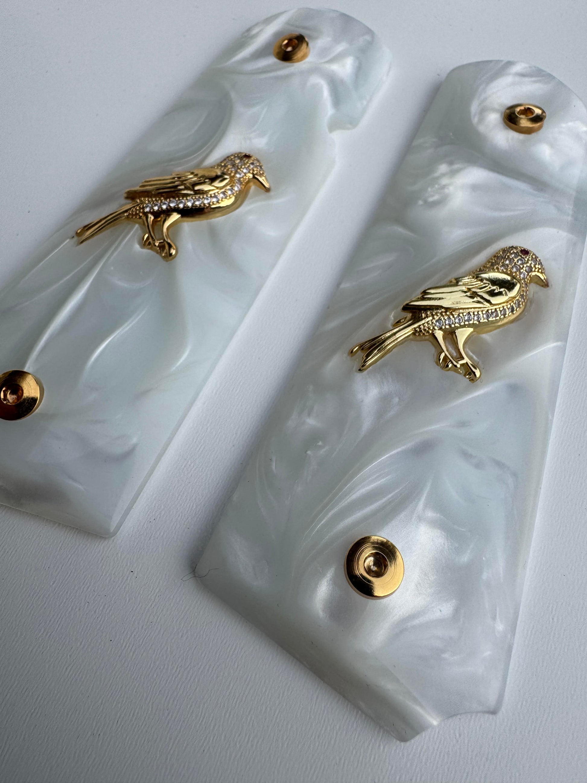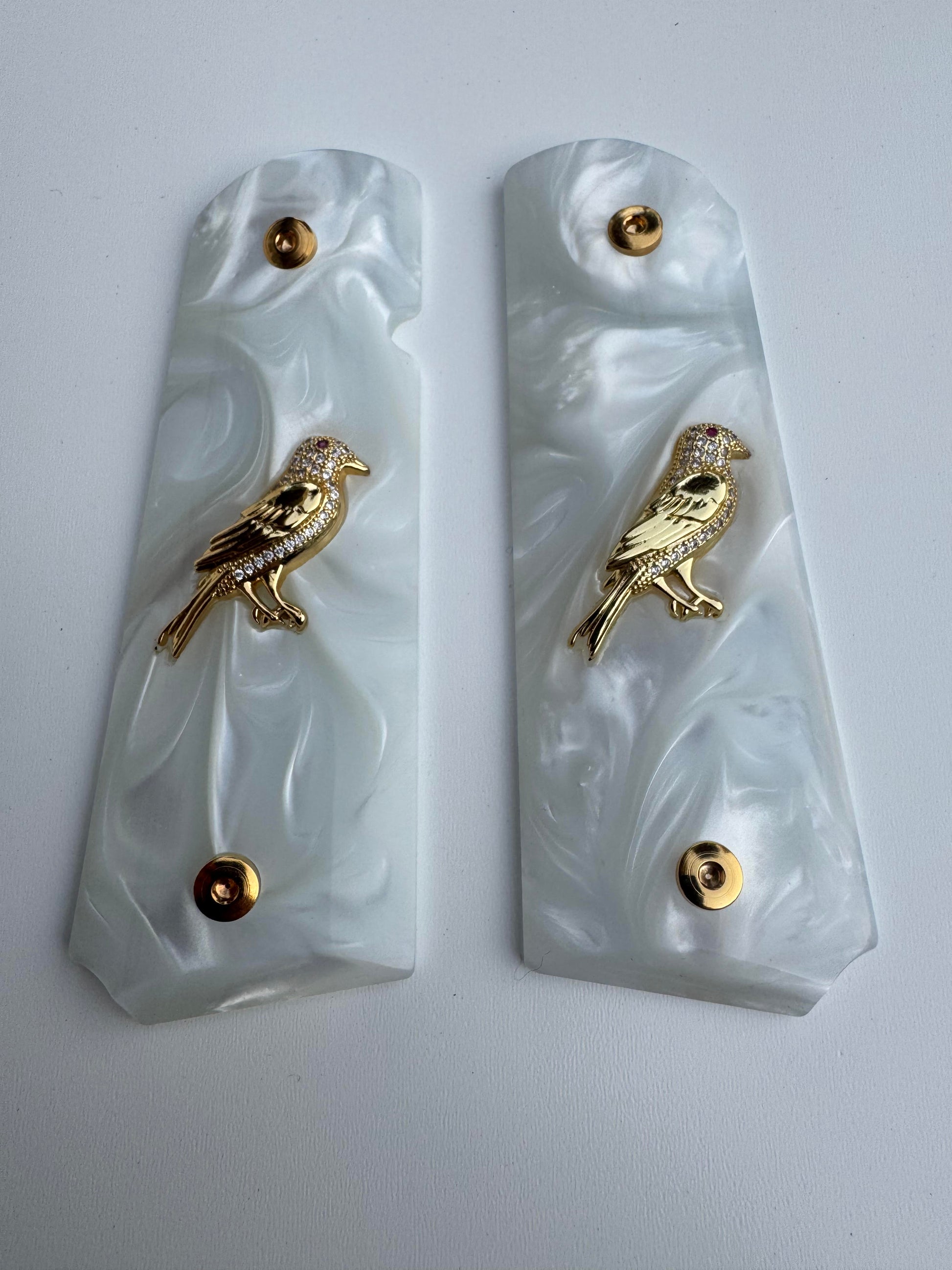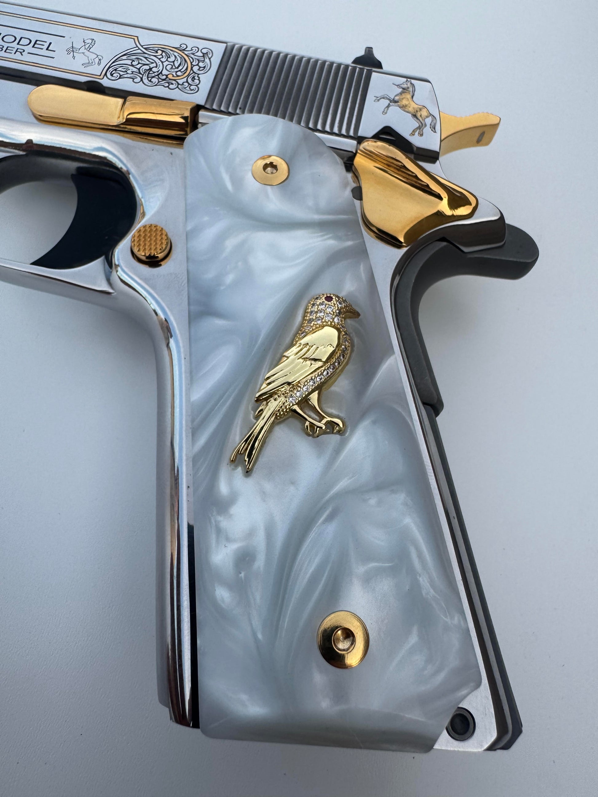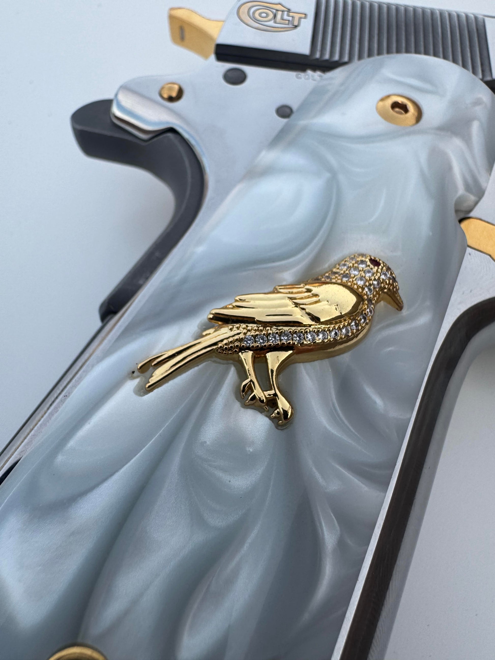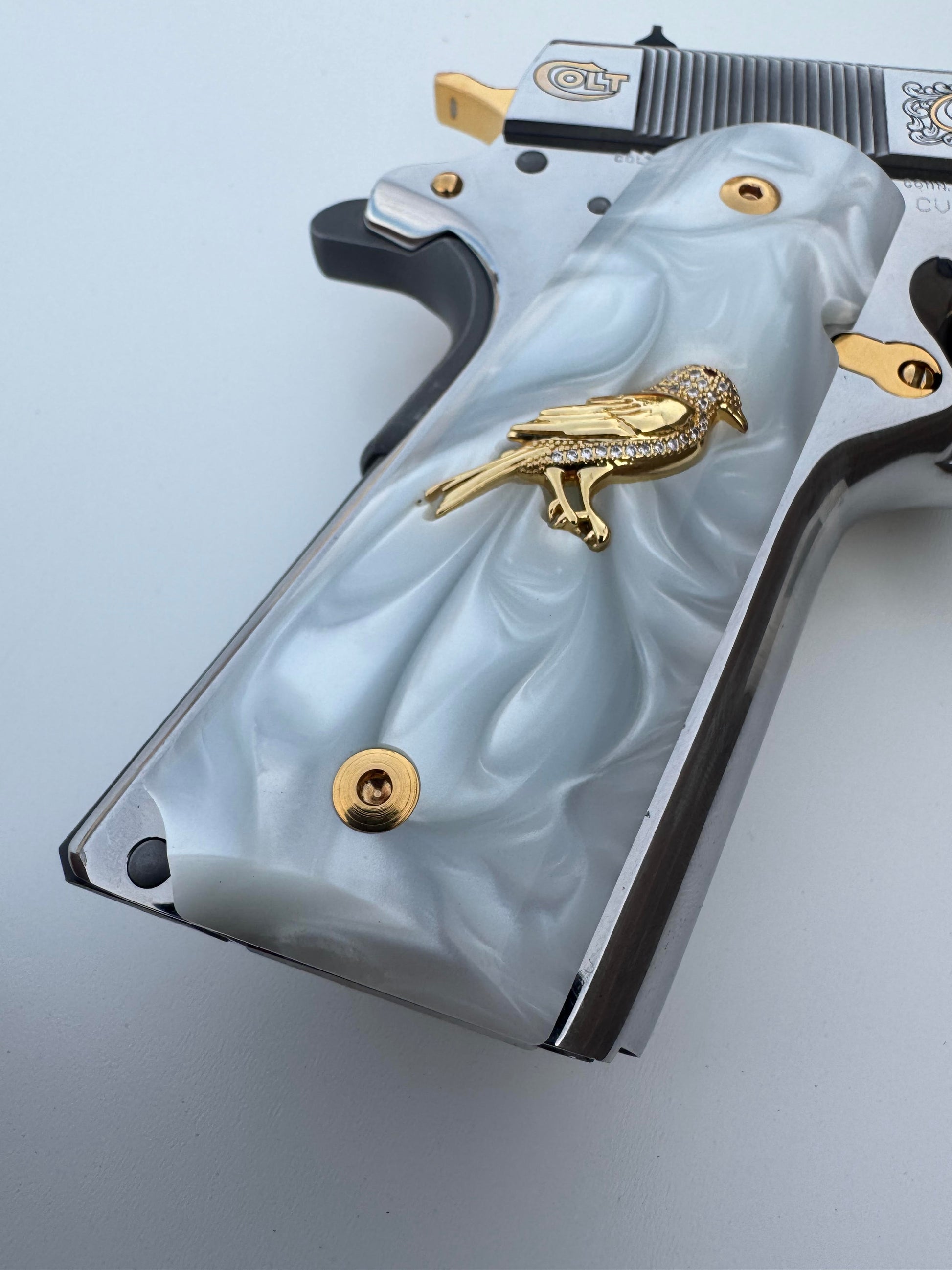 1911 Crow White Pearl Grips 24k Plated .45 38 Super caliber