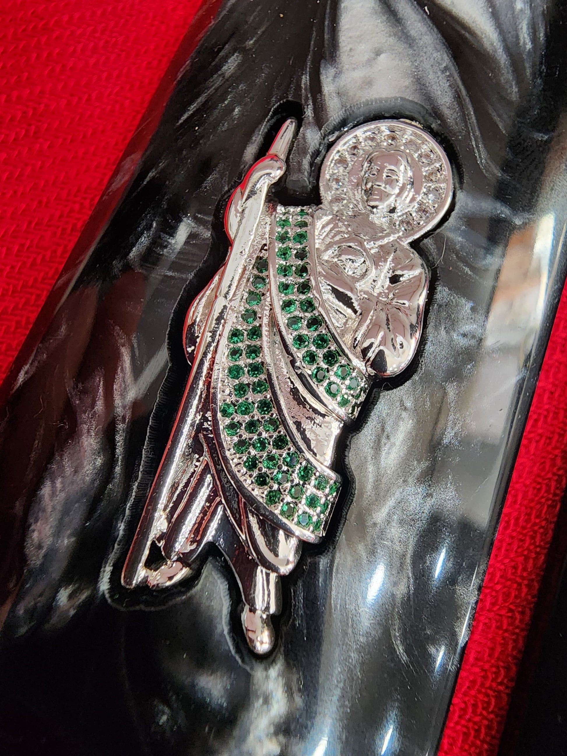 - Inlay: Silver-tone San Judas figure with shimmering emerald-like detail