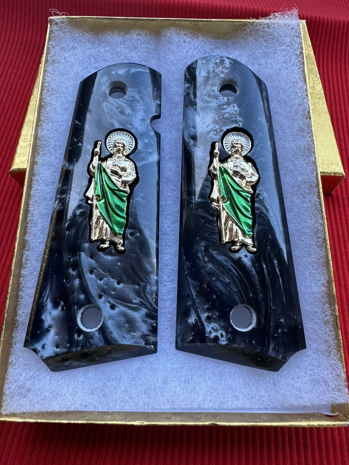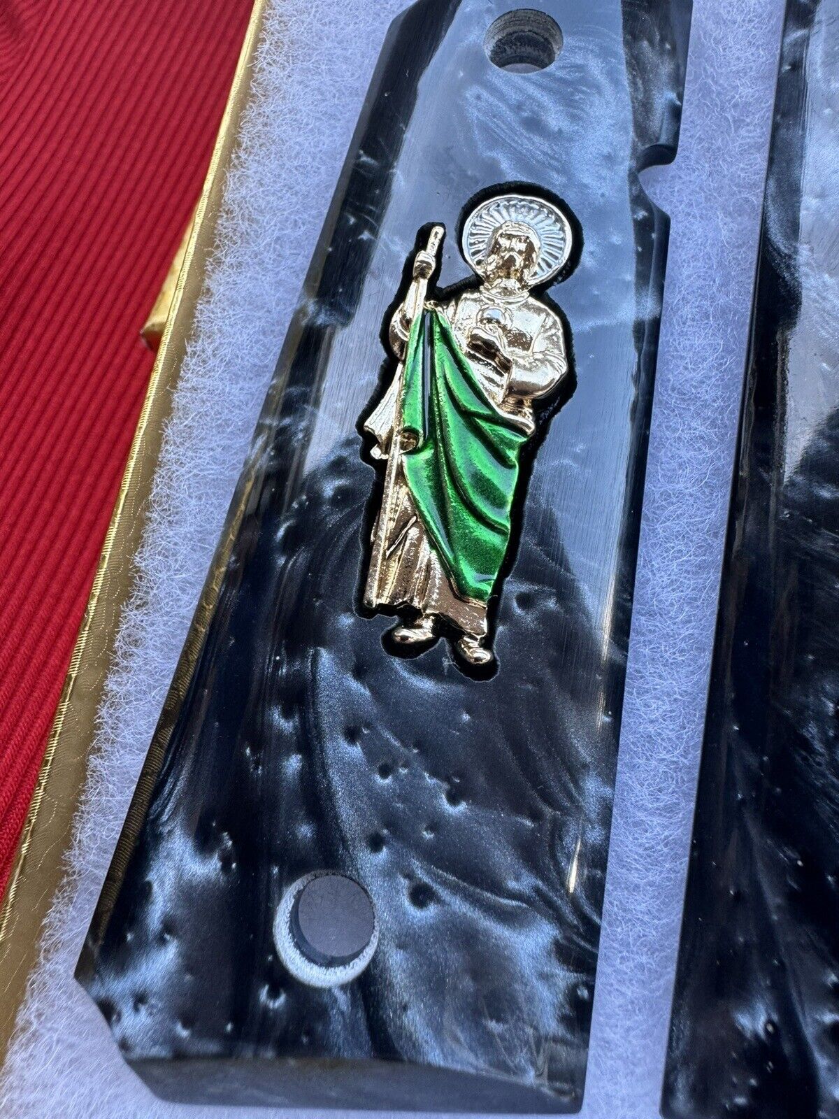 Here we have a beautiful pair of engraved 1911 Grips with a San Judas 24k gold plated. The pendant lays inside of a perfectly laser cut mold.