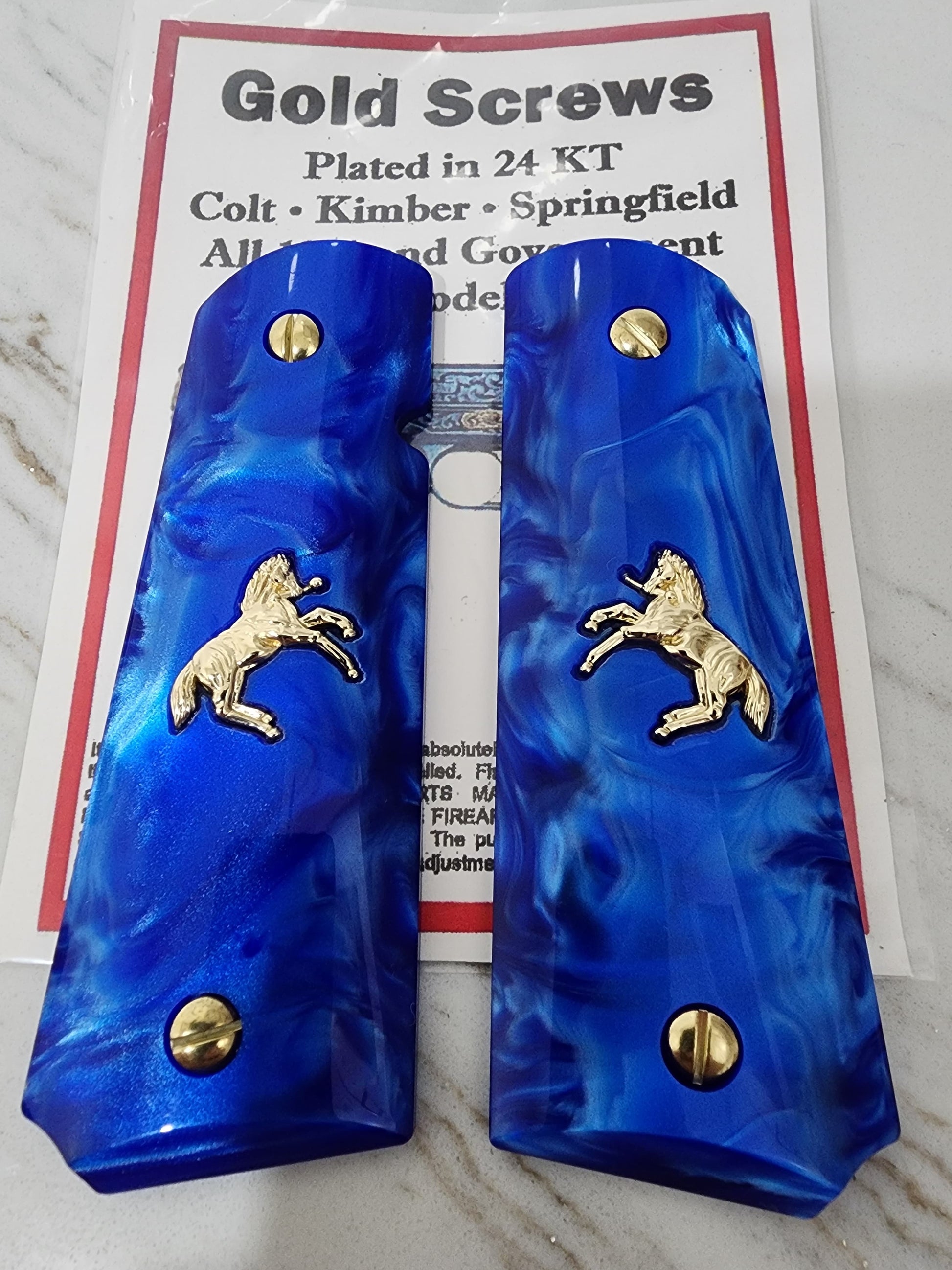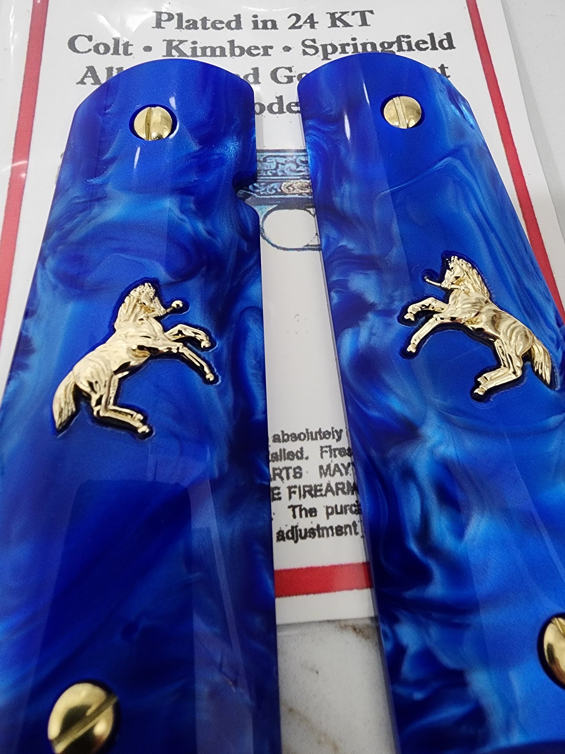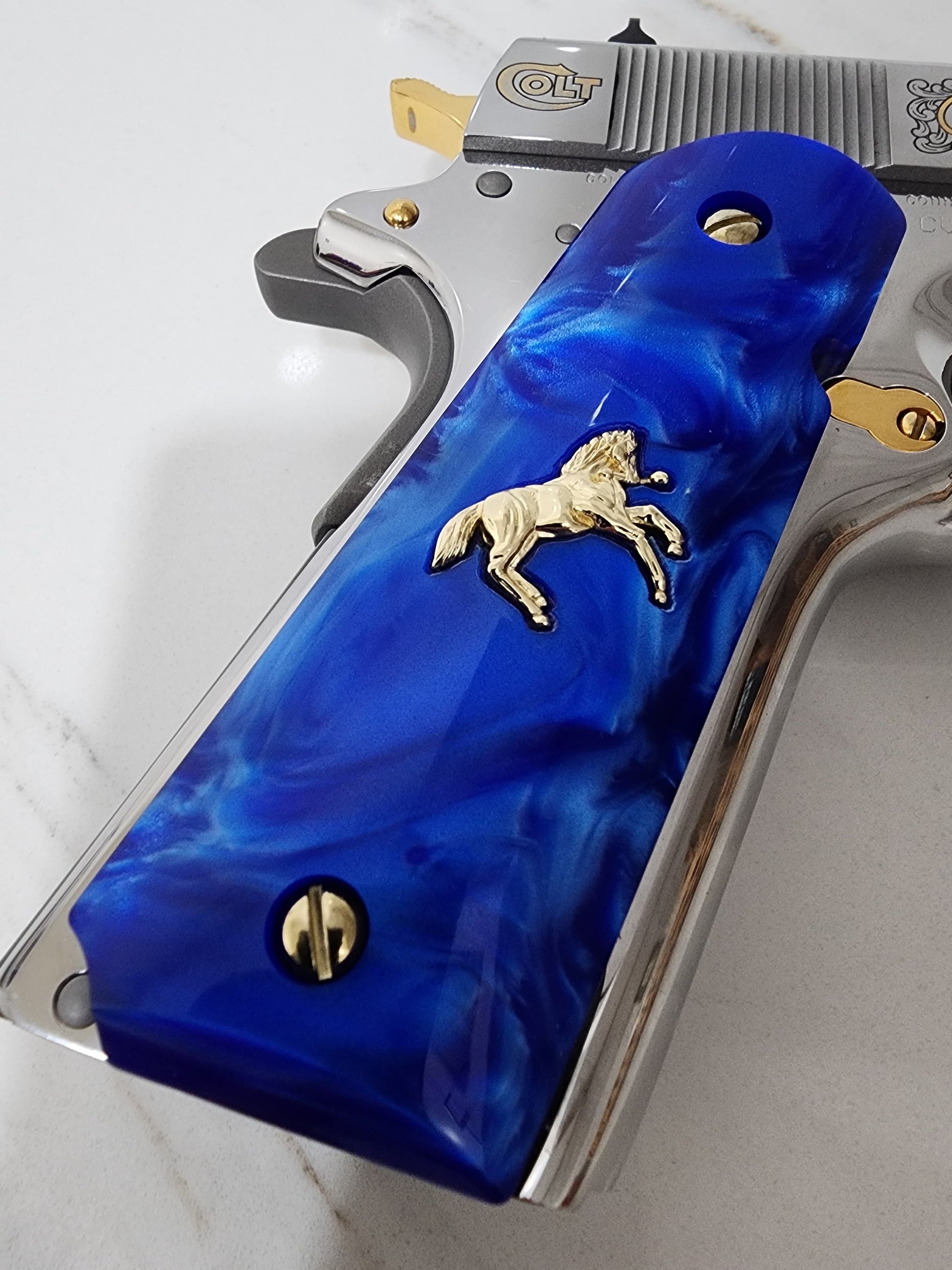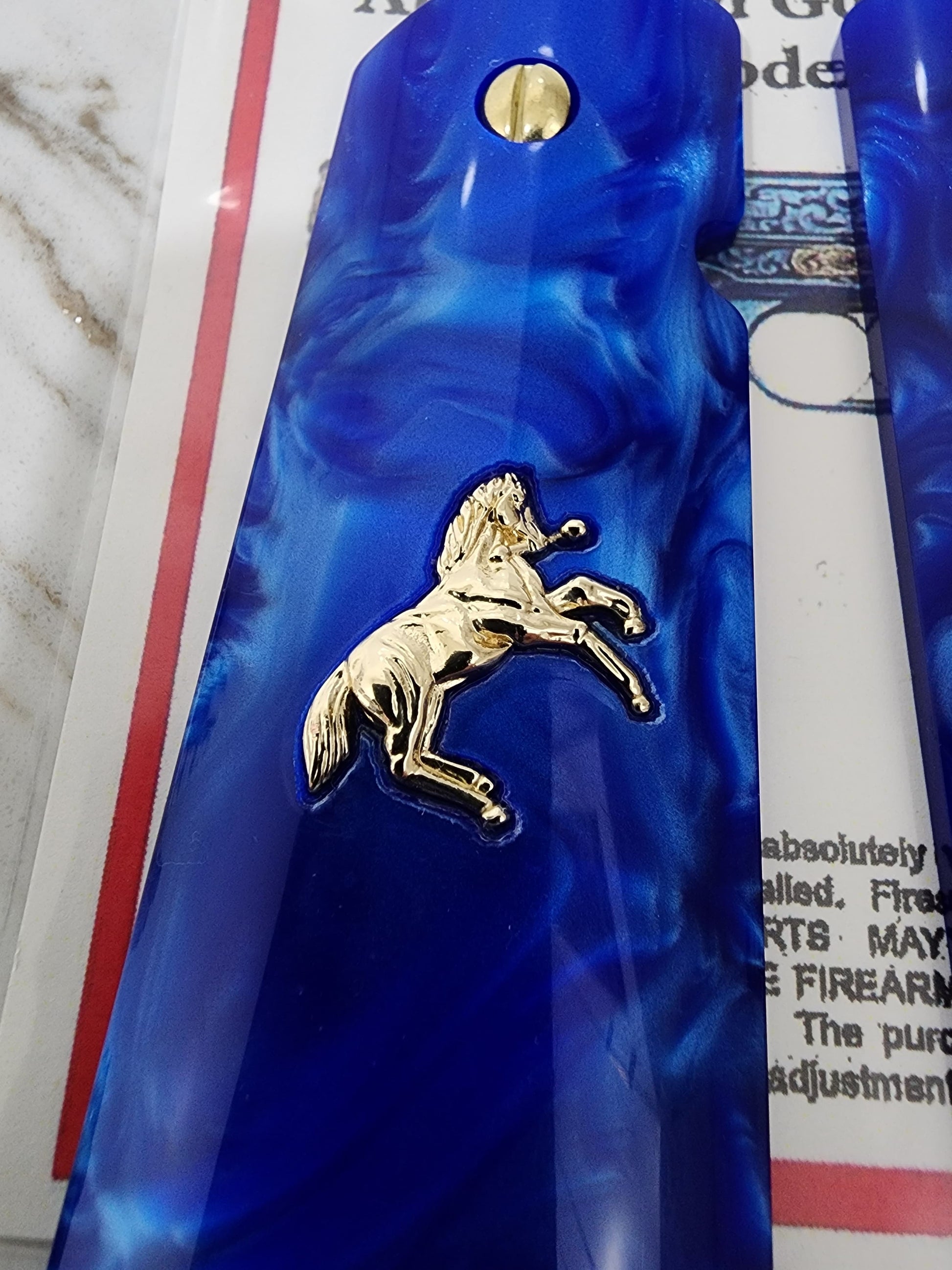 1911 Grips – Royal Swirl Blue Pearl with Rampart Horse Emblem (24k Gold Screws)