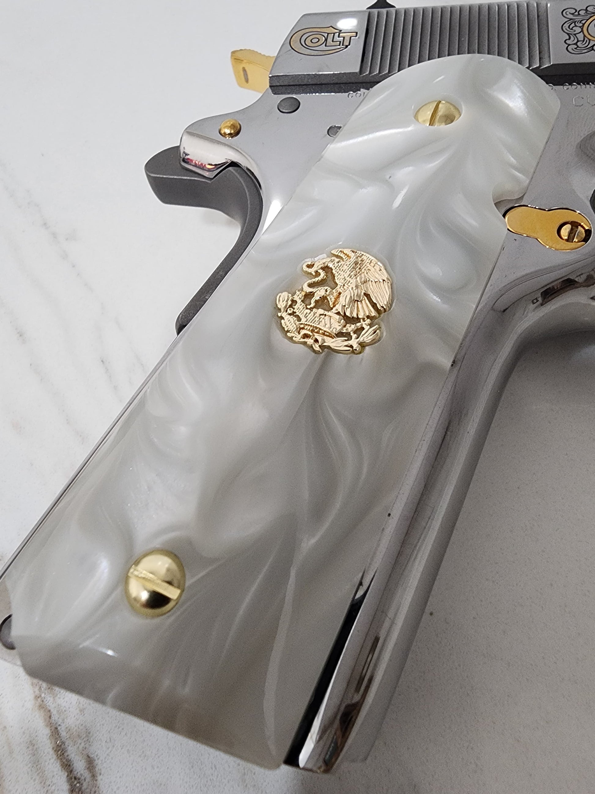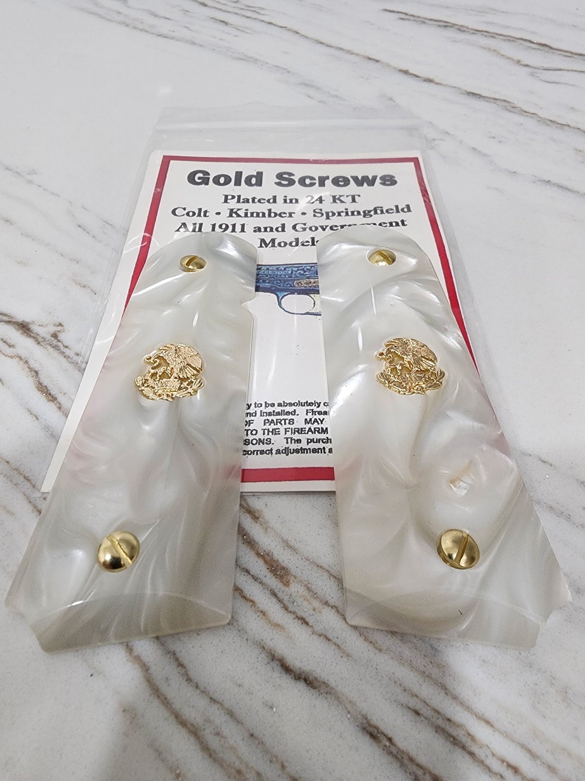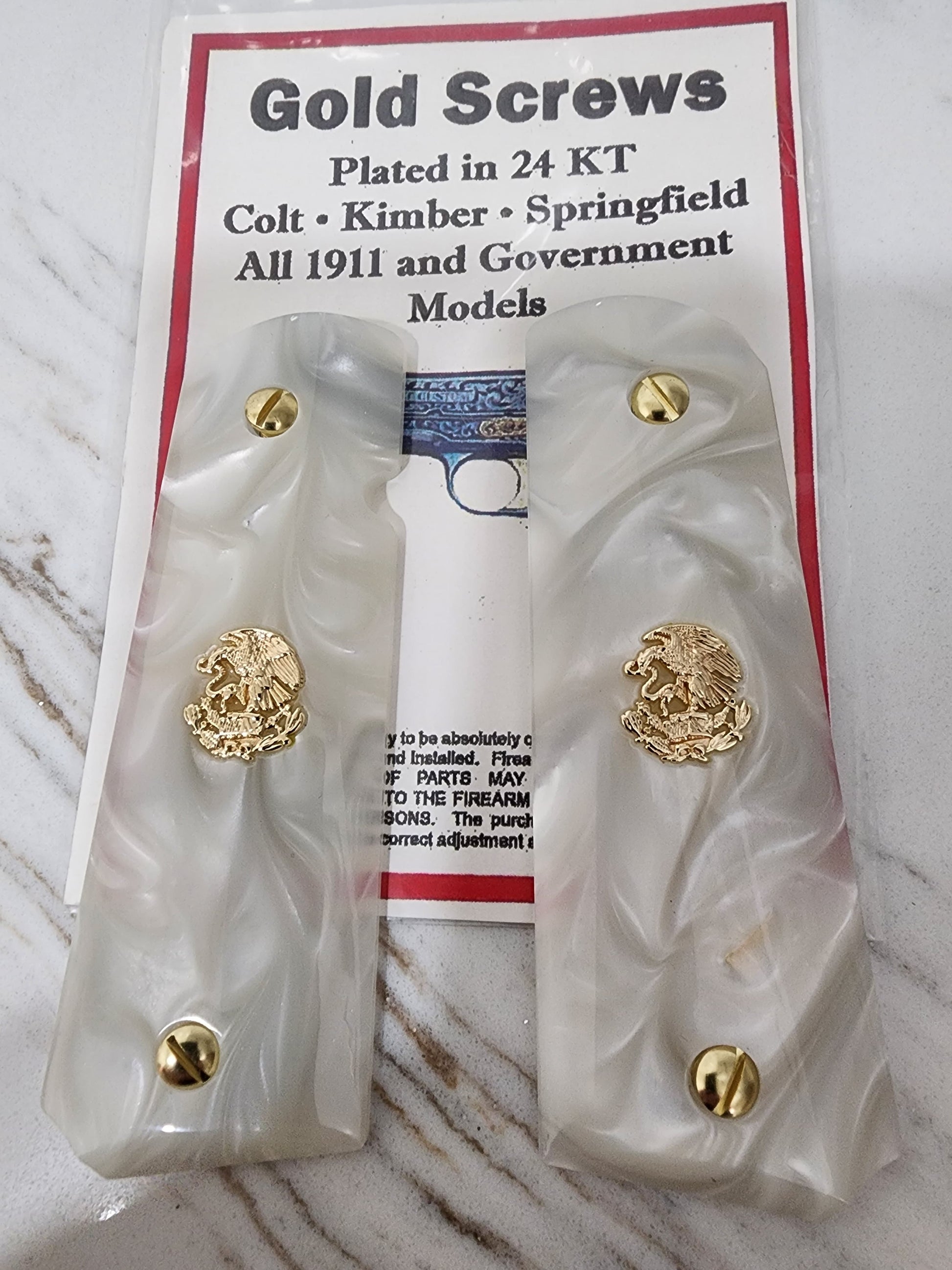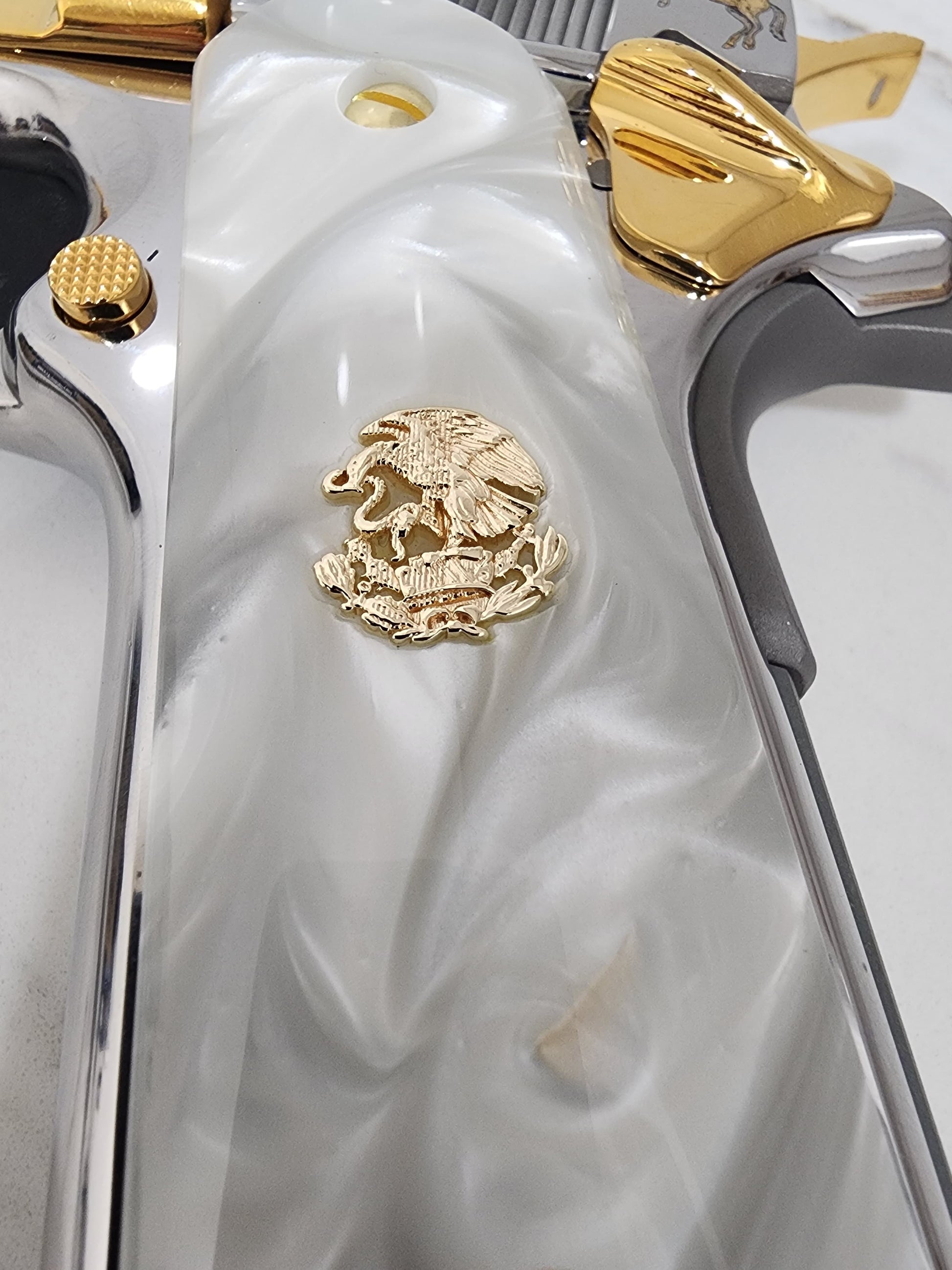 1911 Grips – White Pearl with 24k Gold Plated Mexican Eagle Emblems (24k Gold Screws)