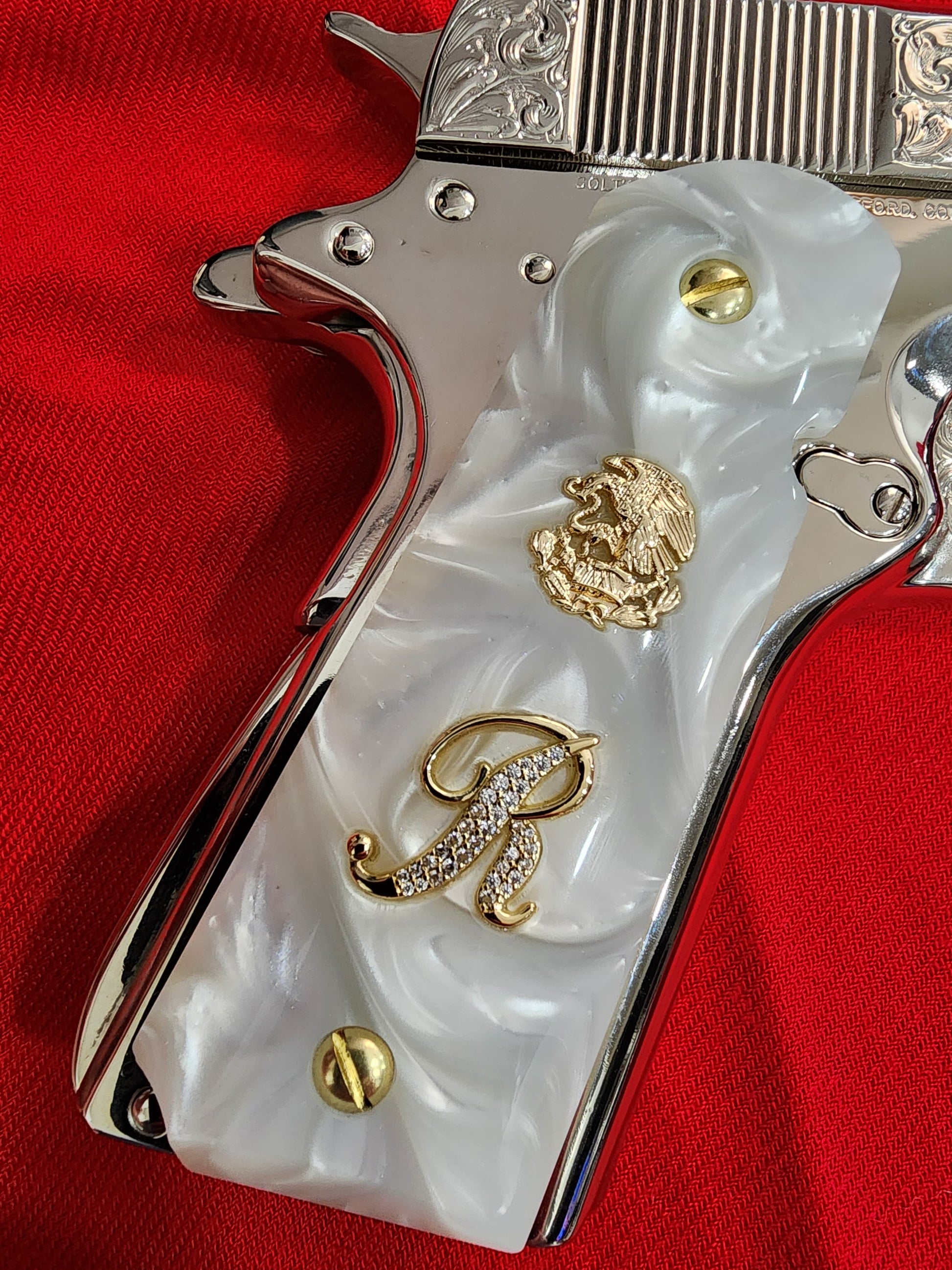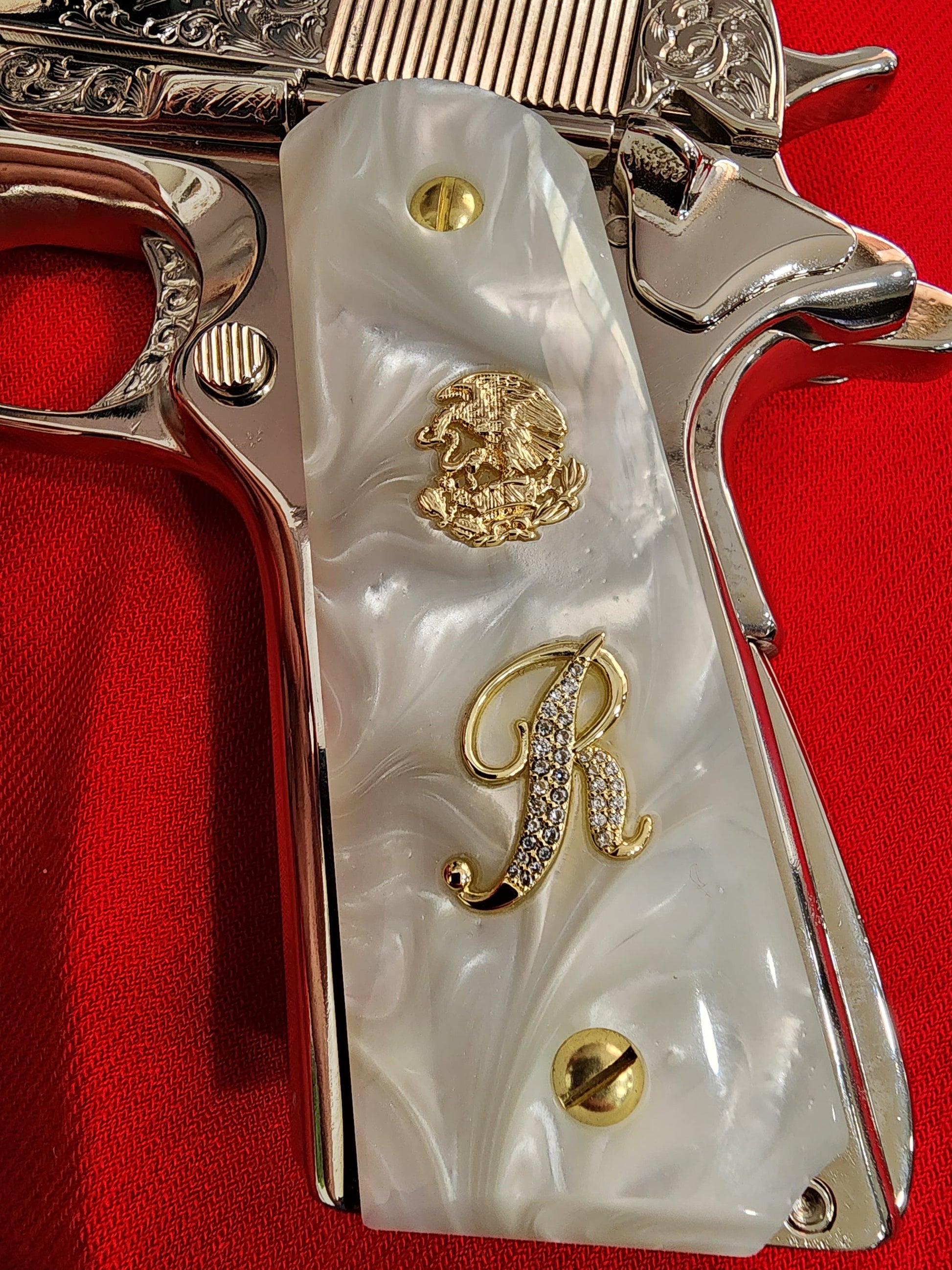 Upgrade your 1911 with this luxurious custom grip set. Made from durable, high-gloss white pearlite, these grips feature a stunning gold-plated Mexican eagle seal and a dazzling letter “R” initial, encrusted with brilliant clear stones. Designed to fit full-size Colt, Kimber, and Springfield 1911 models, this grip set combines elegance and identity in one bold statement.