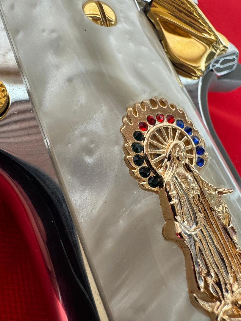 1911 Pearl Grips Engraved Grips Virgin Mary inlayed 24k cz stones Gold Plated 45 acp