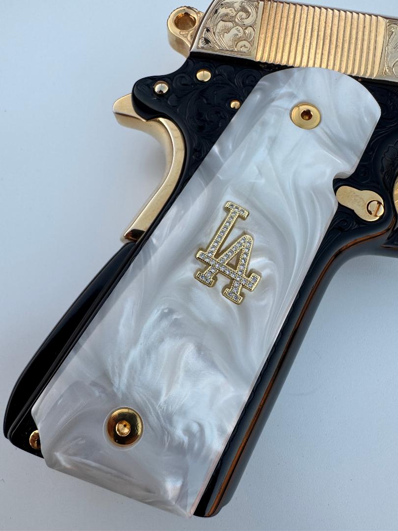 1911 White Pearl Grips - LA - design inlayed 24k Gold Plated 45 acp 38 Super