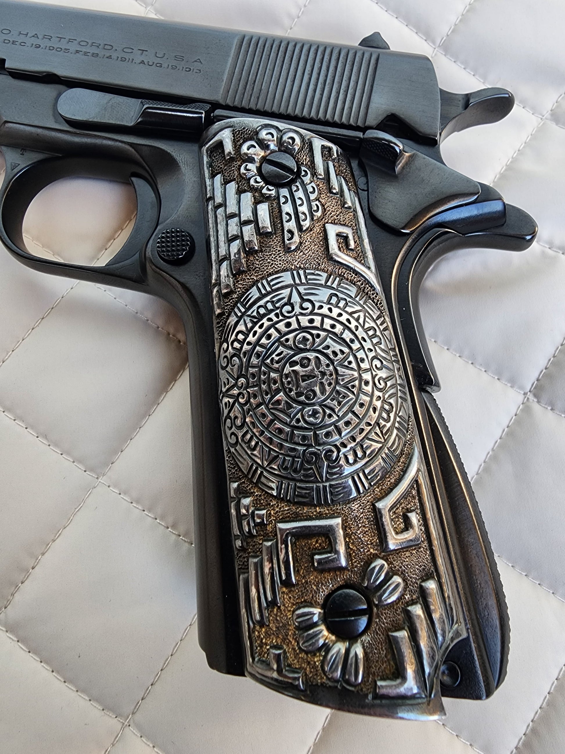 *EXTREMELY RARE* Genuine 9.25 Sterling Silver 1911 Pistol Grips – Aztec Calendar Design – 106g – Handcrafted Luxury Silver Mexican Vintage Engraved