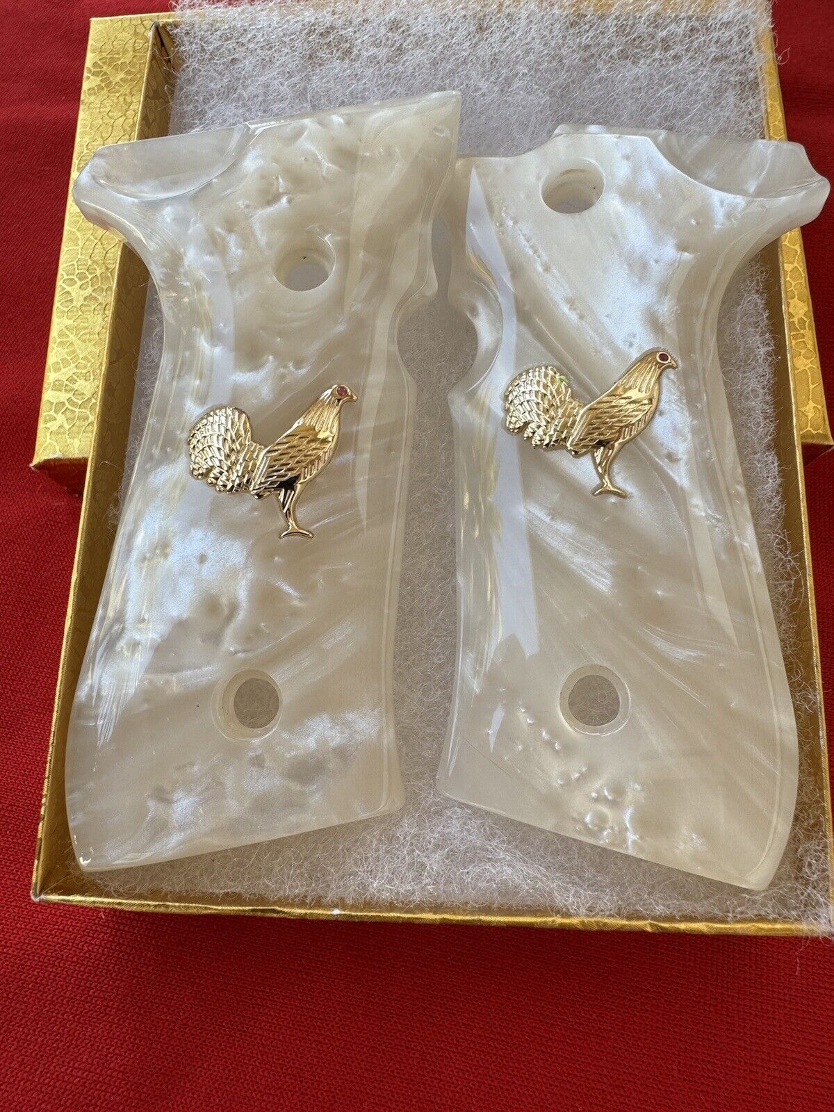 This listing is for a unique pair of Beretta Gallo 92fs 96fs M9 9mm 40 caliber Pearlite Custom Engraved grips.