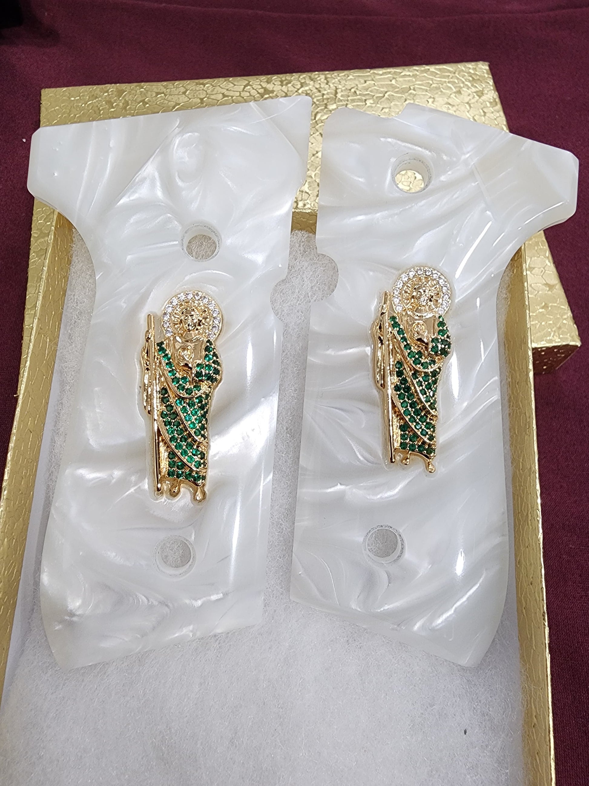 Show your heritage with pride using these custom white pearlite Beretta 92 Fs 96 Fs M9 grips, featuring a bold San Judas accented with sparkling CZ stones. Designed for Beretta pistols, these grips combine patriotic symbolism with luxury and craftsmanship.