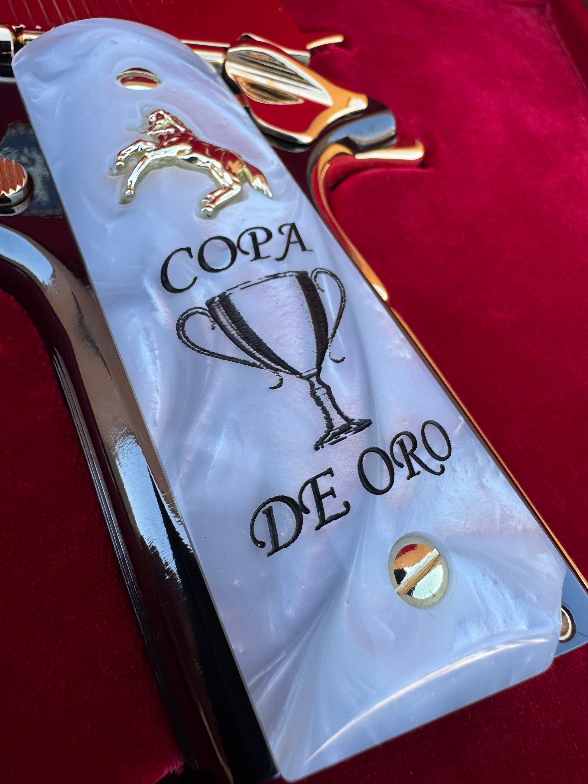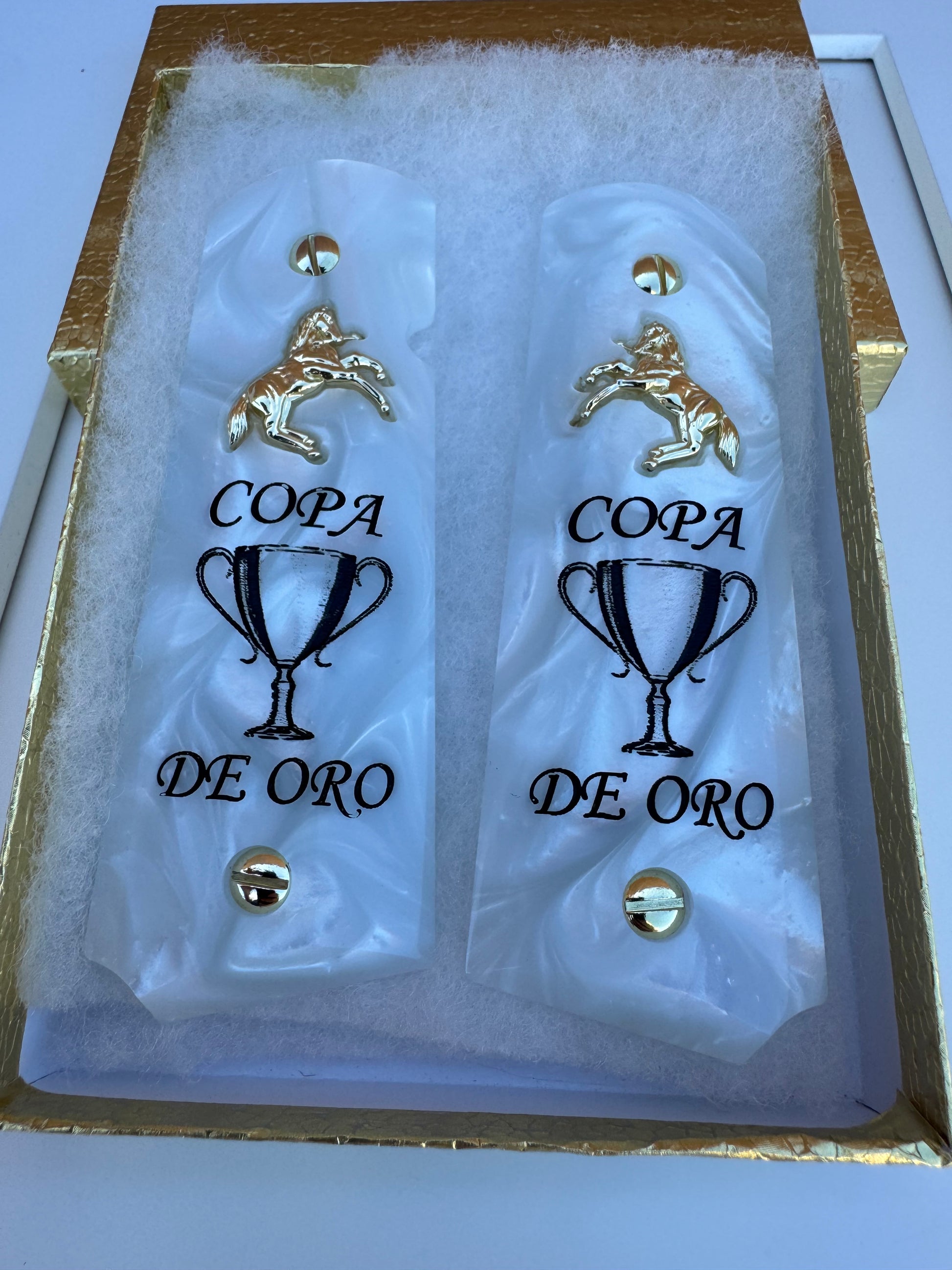 Add a touch of championship spirit to your 1911 with these custom “Copa De Oro” grips, crafted from high-gloss white pearlite and finished with a detailed gold-plated horse emblem and engraved trophy design.