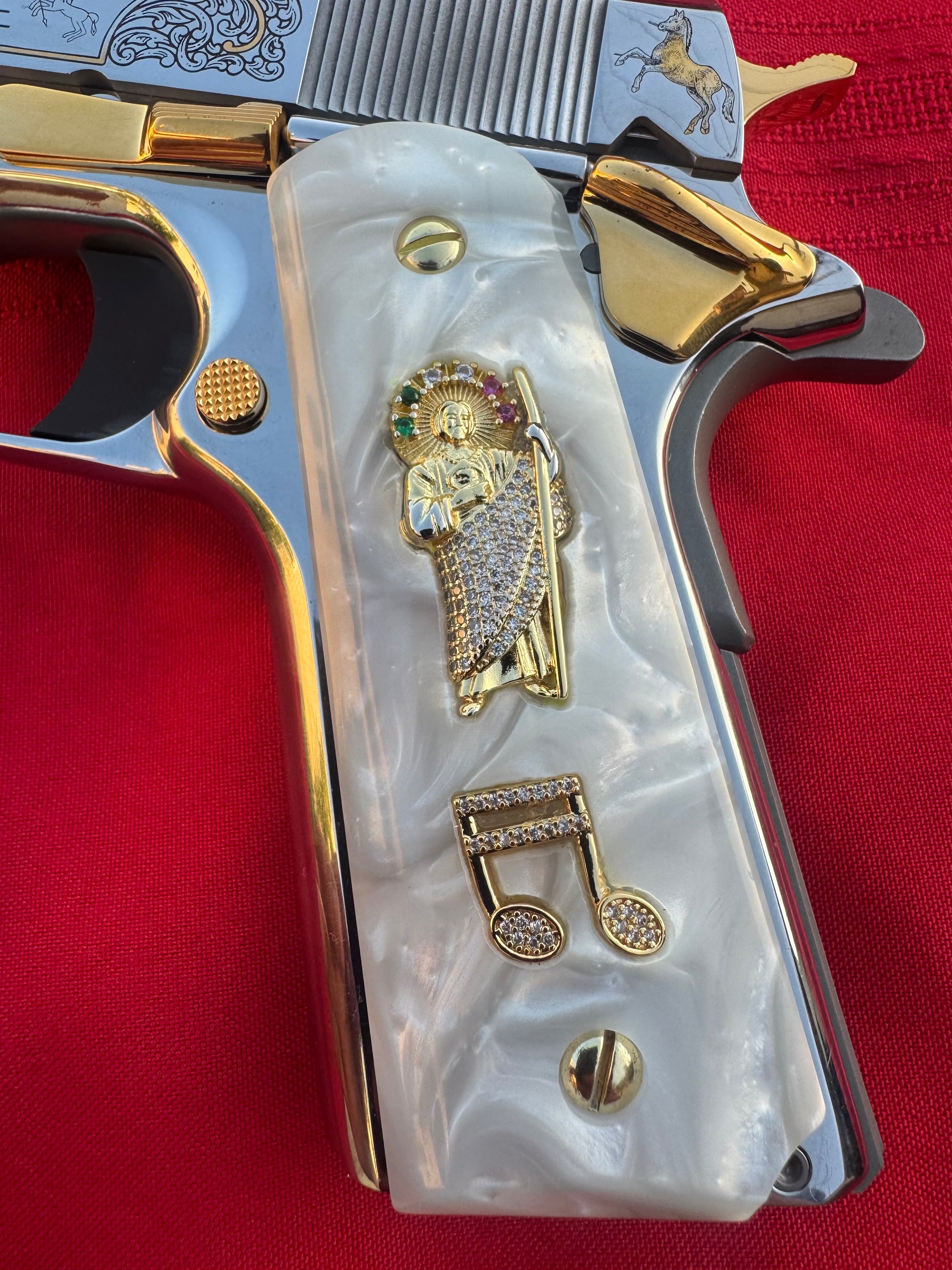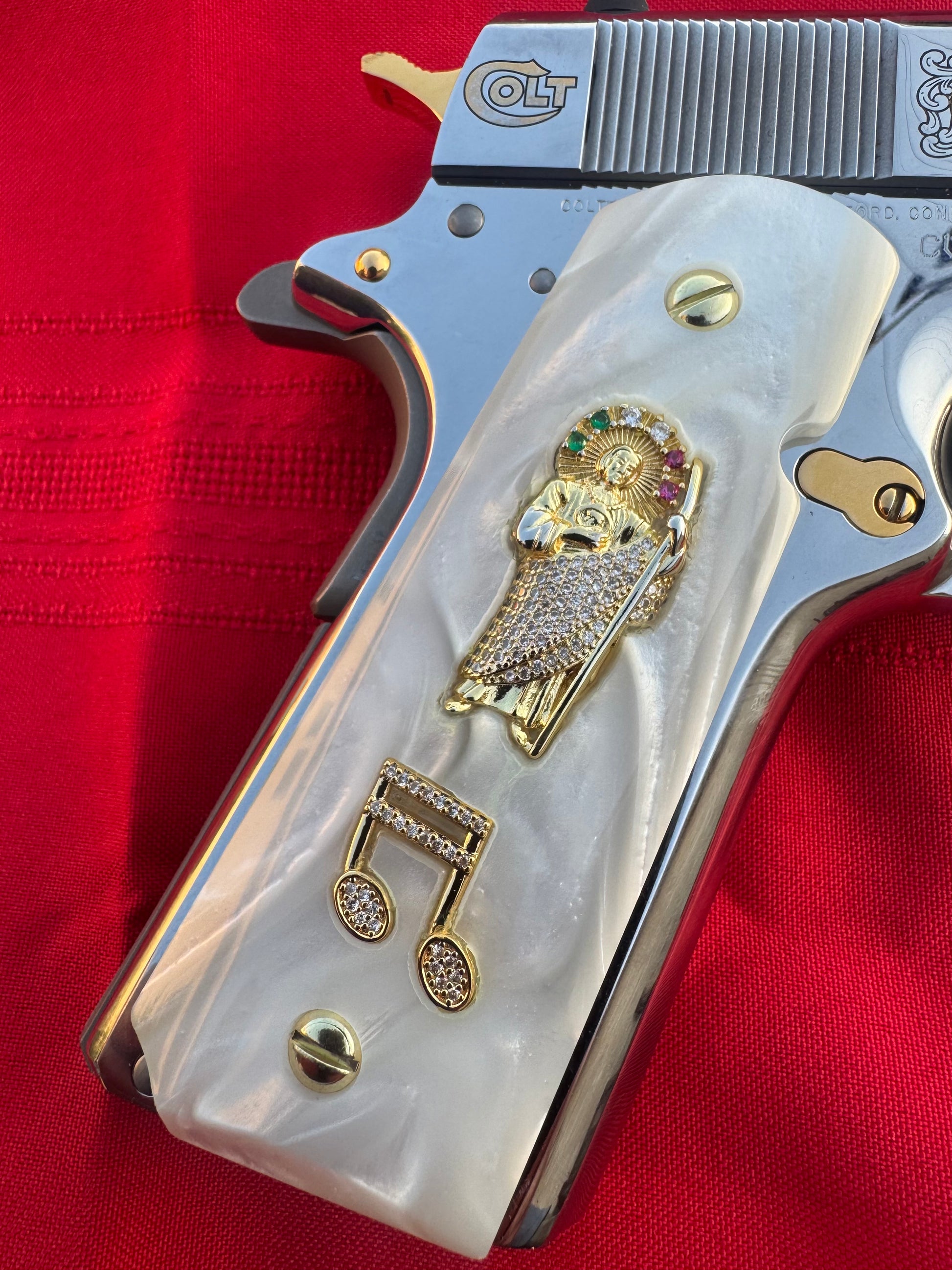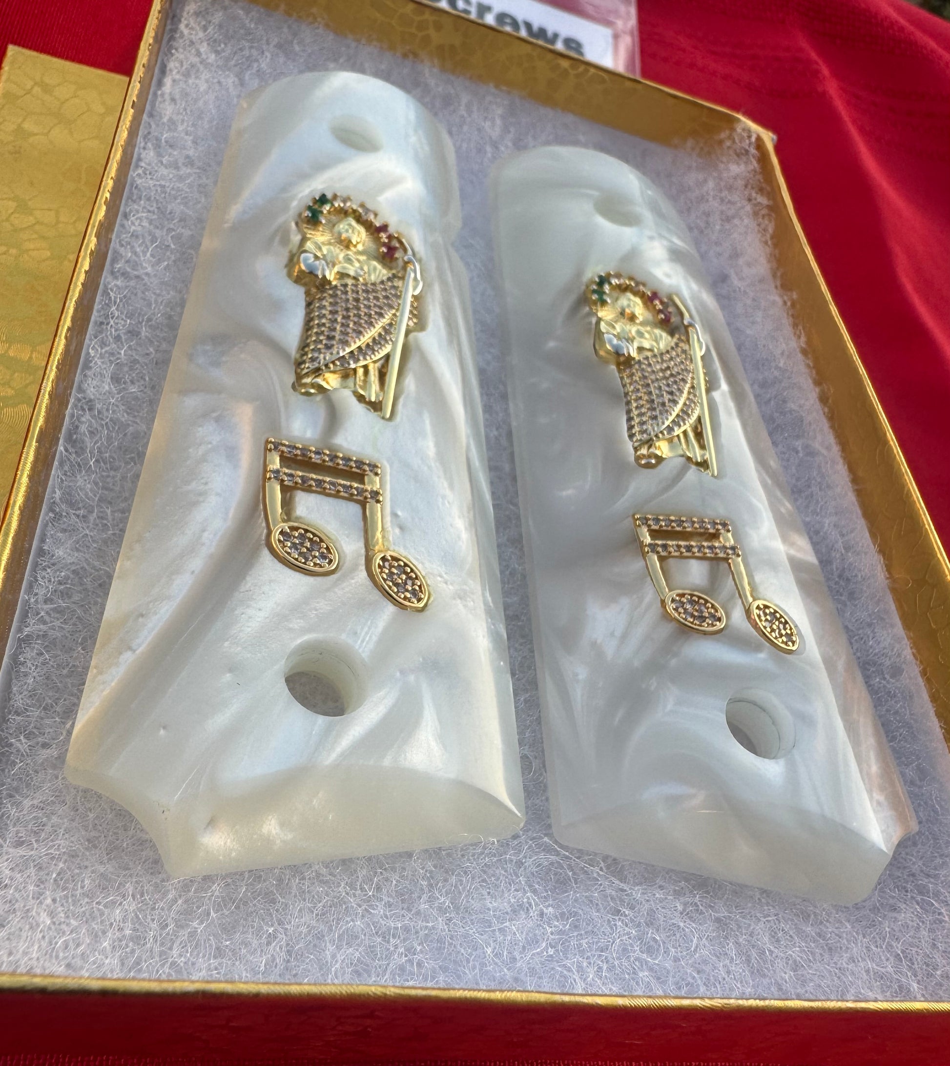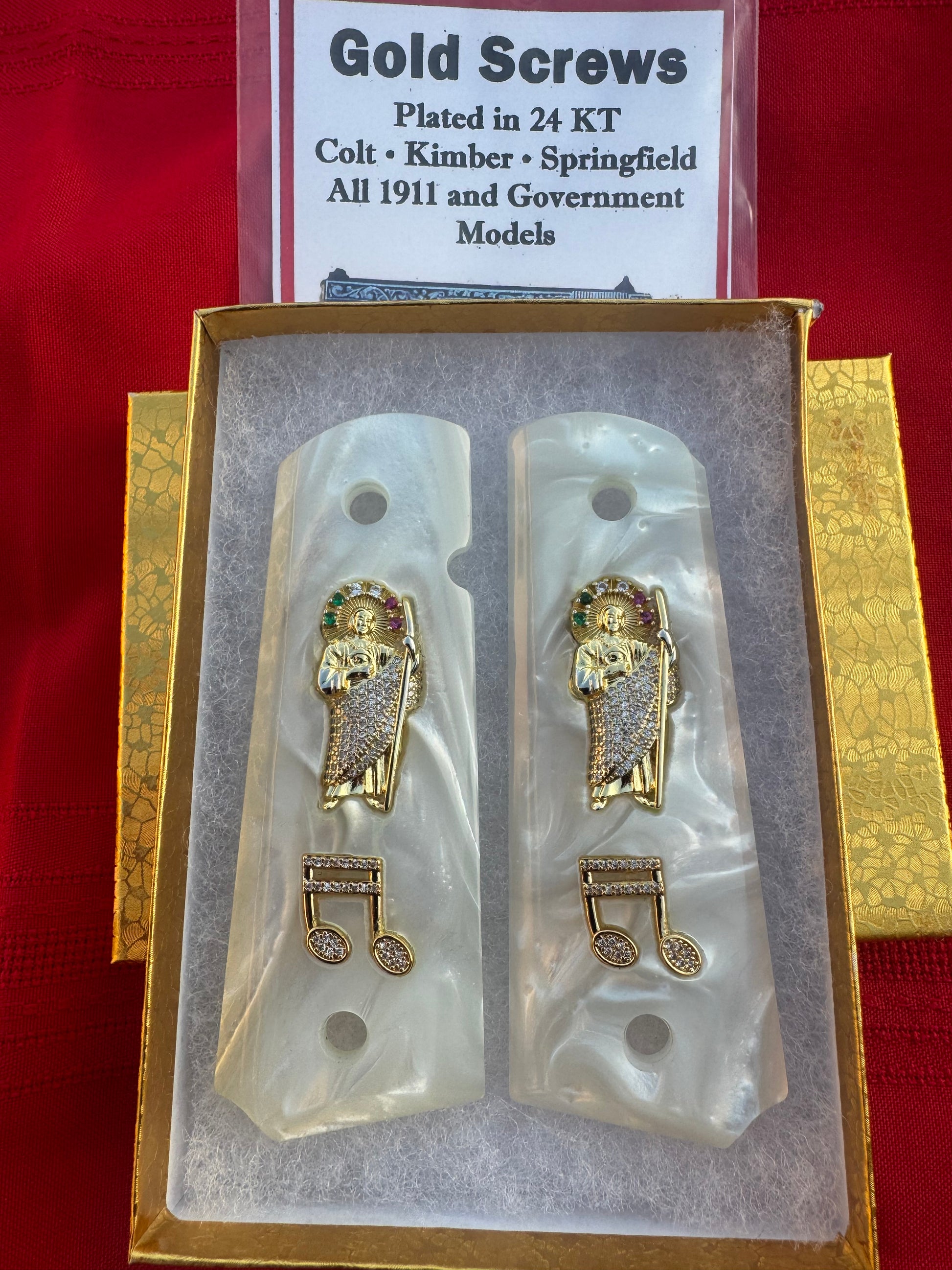 1911 White Pearl Grips – San Judas & Music Note Inlays with Gold plated Screws