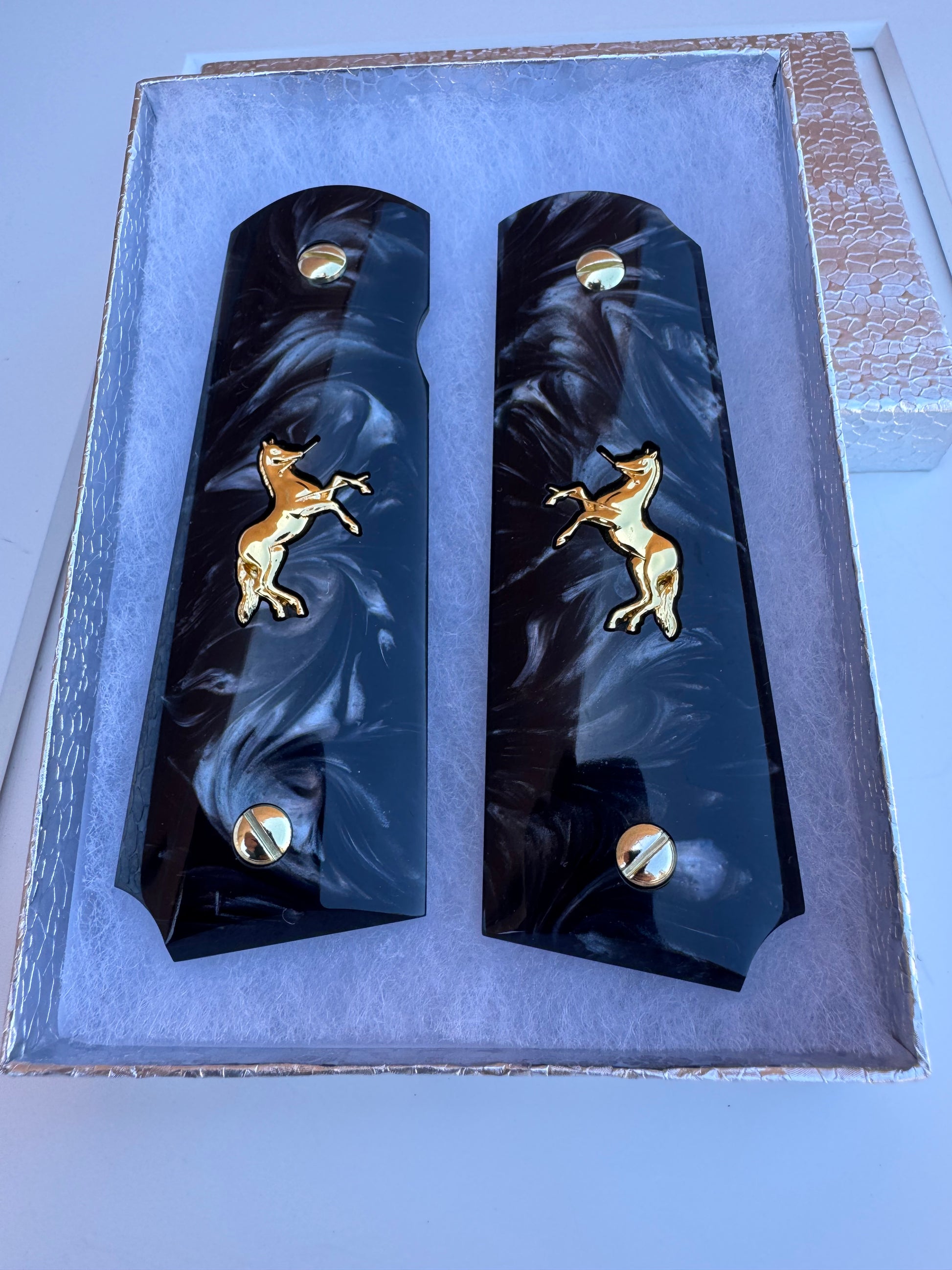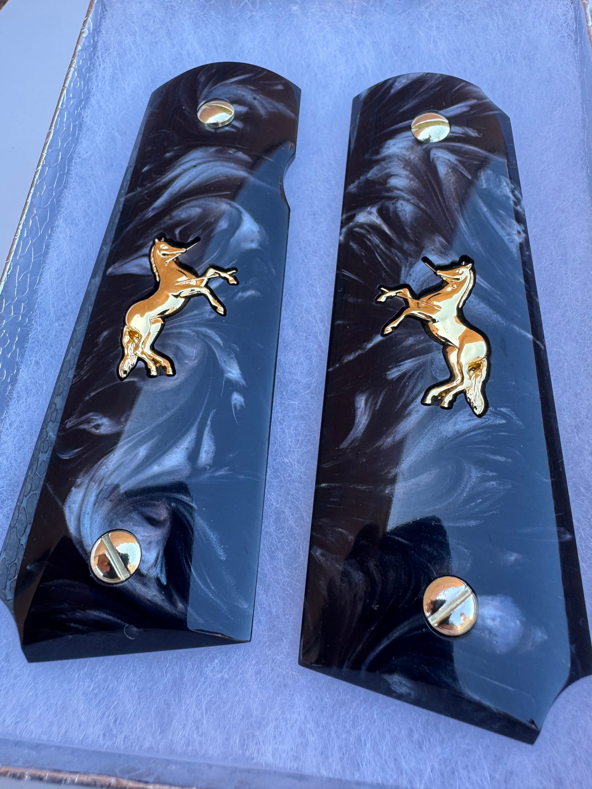 Introducing these stunning 1911 Rampart Horse black pearl grips, plated with luxurious 24k gold and designed for .45 and 38 Super caliber.