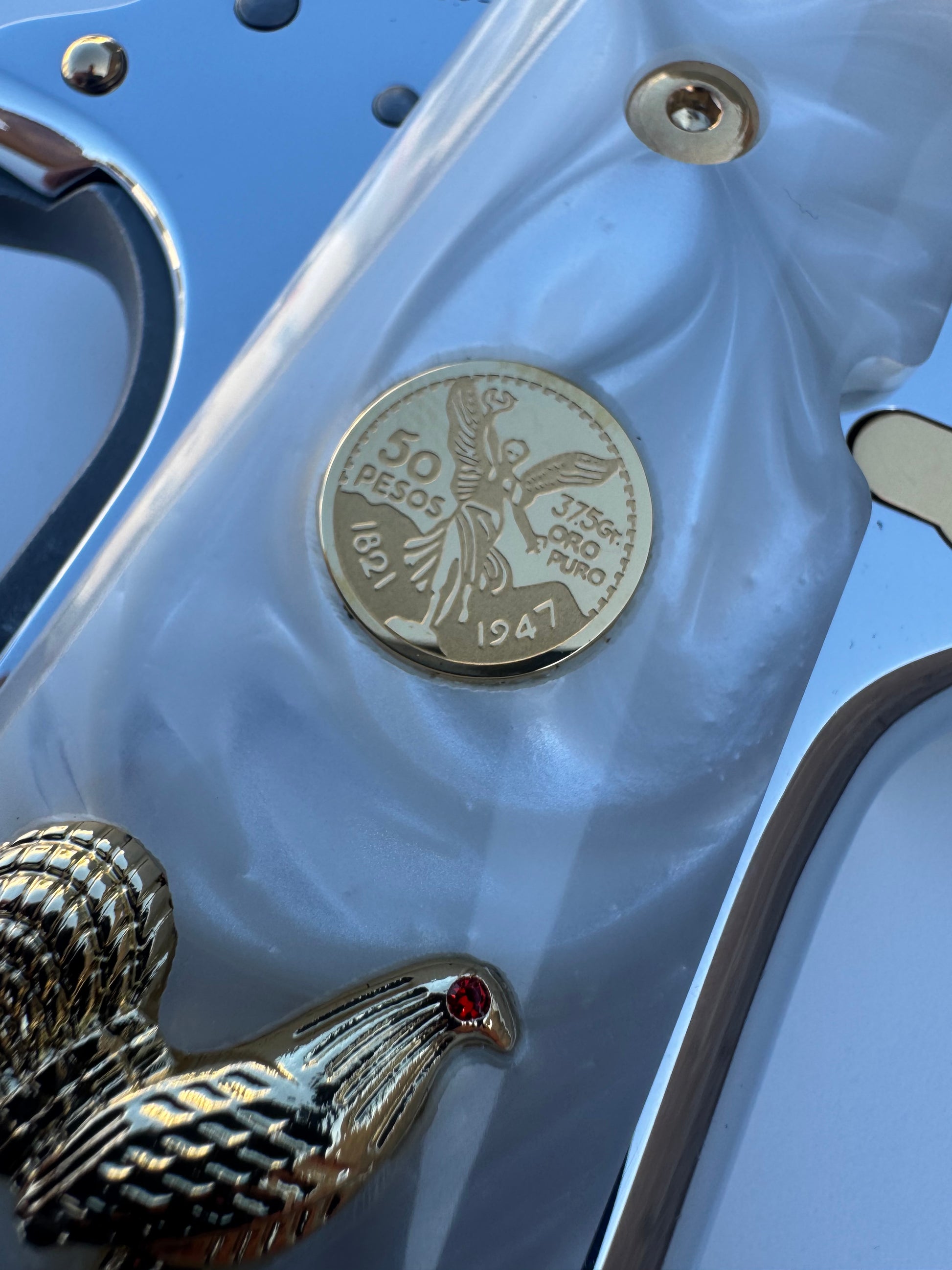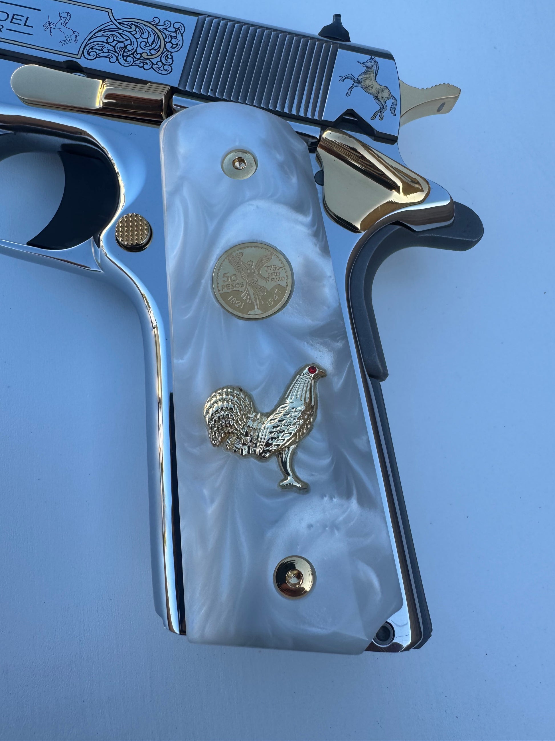 Transform the look of your handgun with these stunning 1911 "Rooster" “Centenario” pearl grips. These engraved pearl grips are designed to fit .45, .38 caliber handguns and are specifically made for the 1911 models.