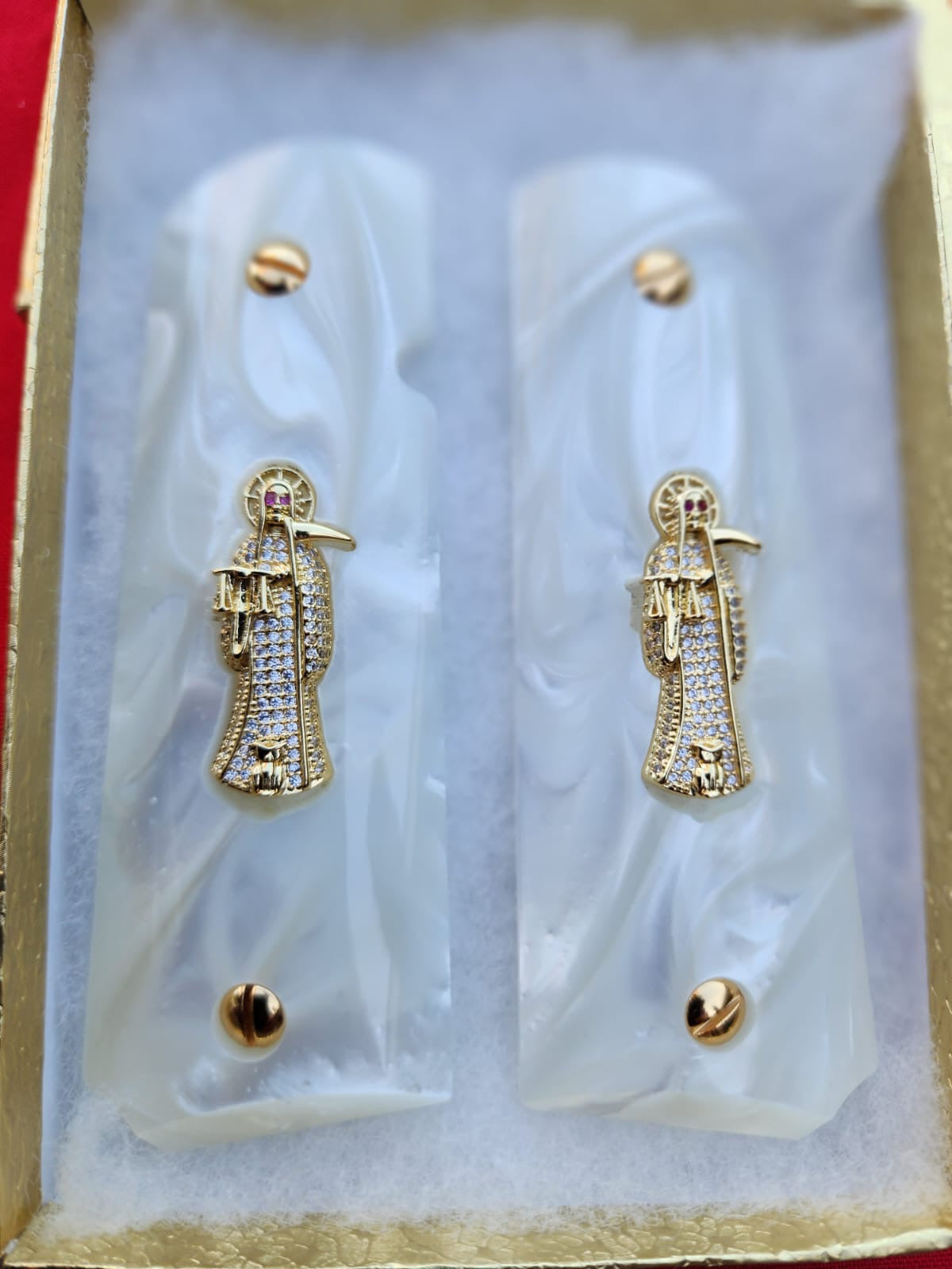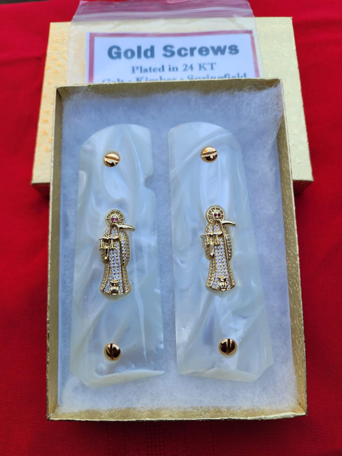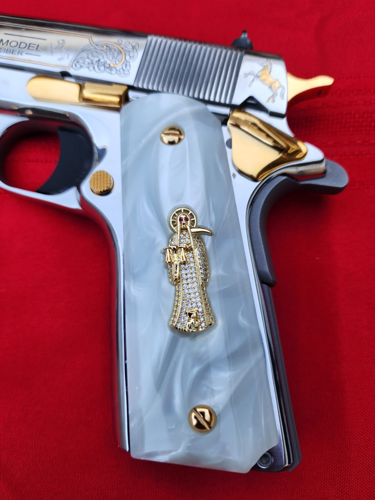 1911 Santa Muerte Design with CZ stones with 24K Gold Plated Screws White Pearlite Grips