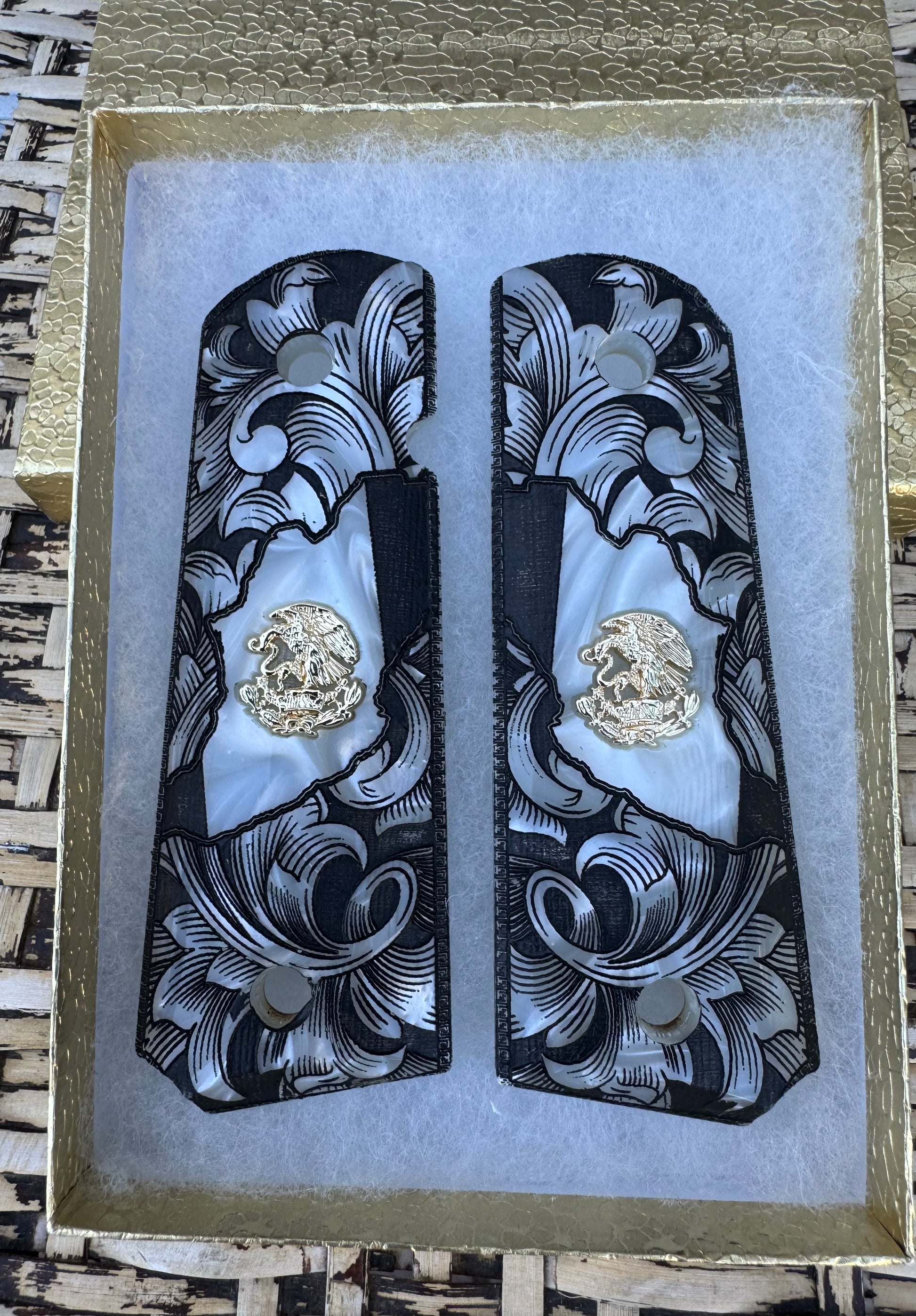 1911 Mexican Eagle 24k Gold Plated with detailed Baroque Scrolls White Pearlite Grips