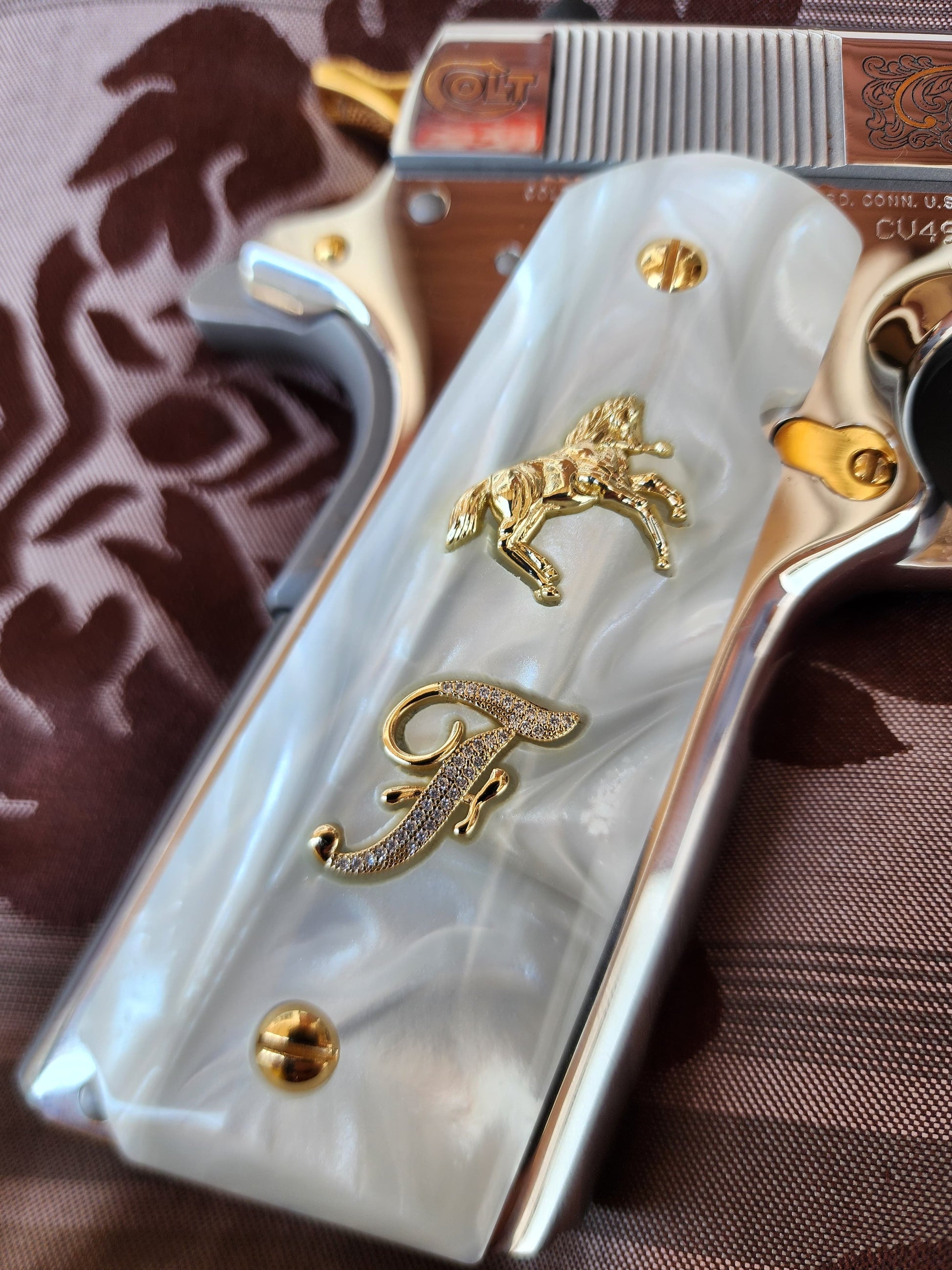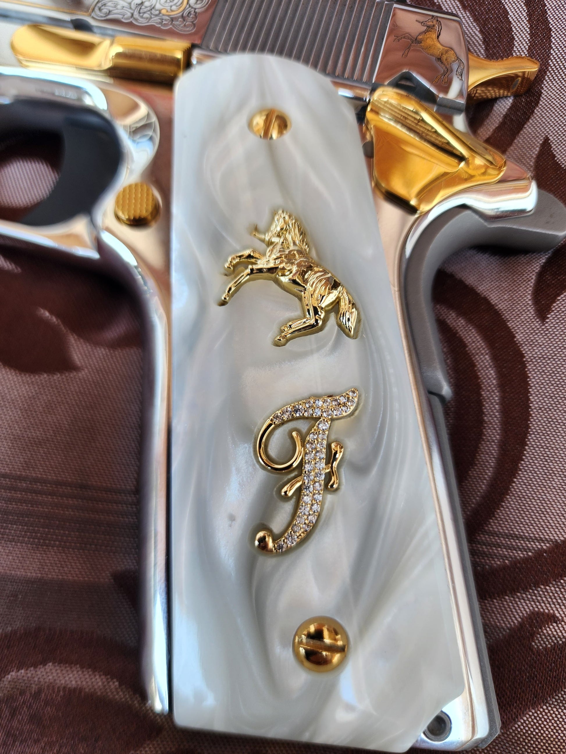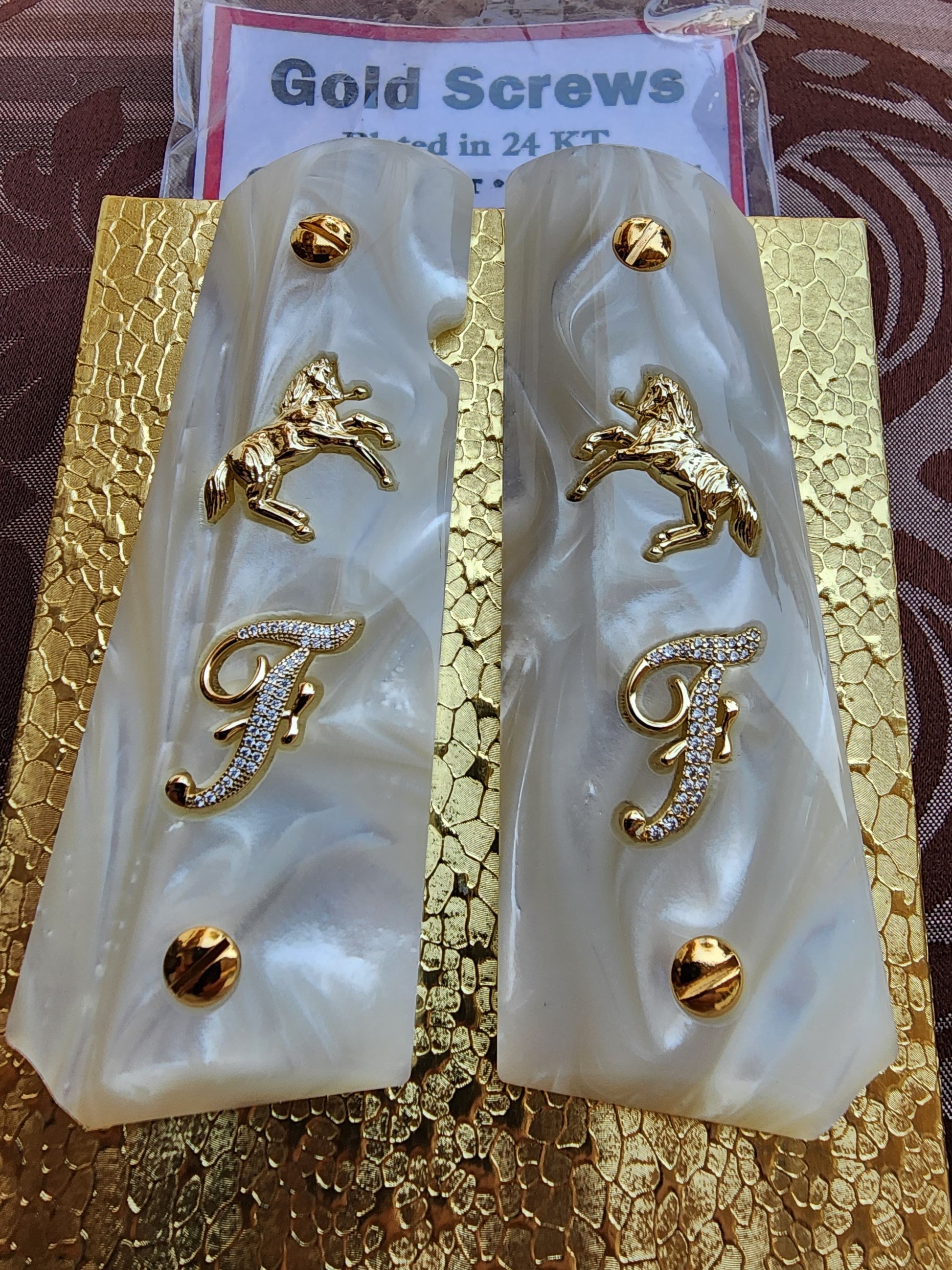 1911 White Pearl Grips Gold “F” Inlays with Horse Emblem & 24K Gold Plated Screws