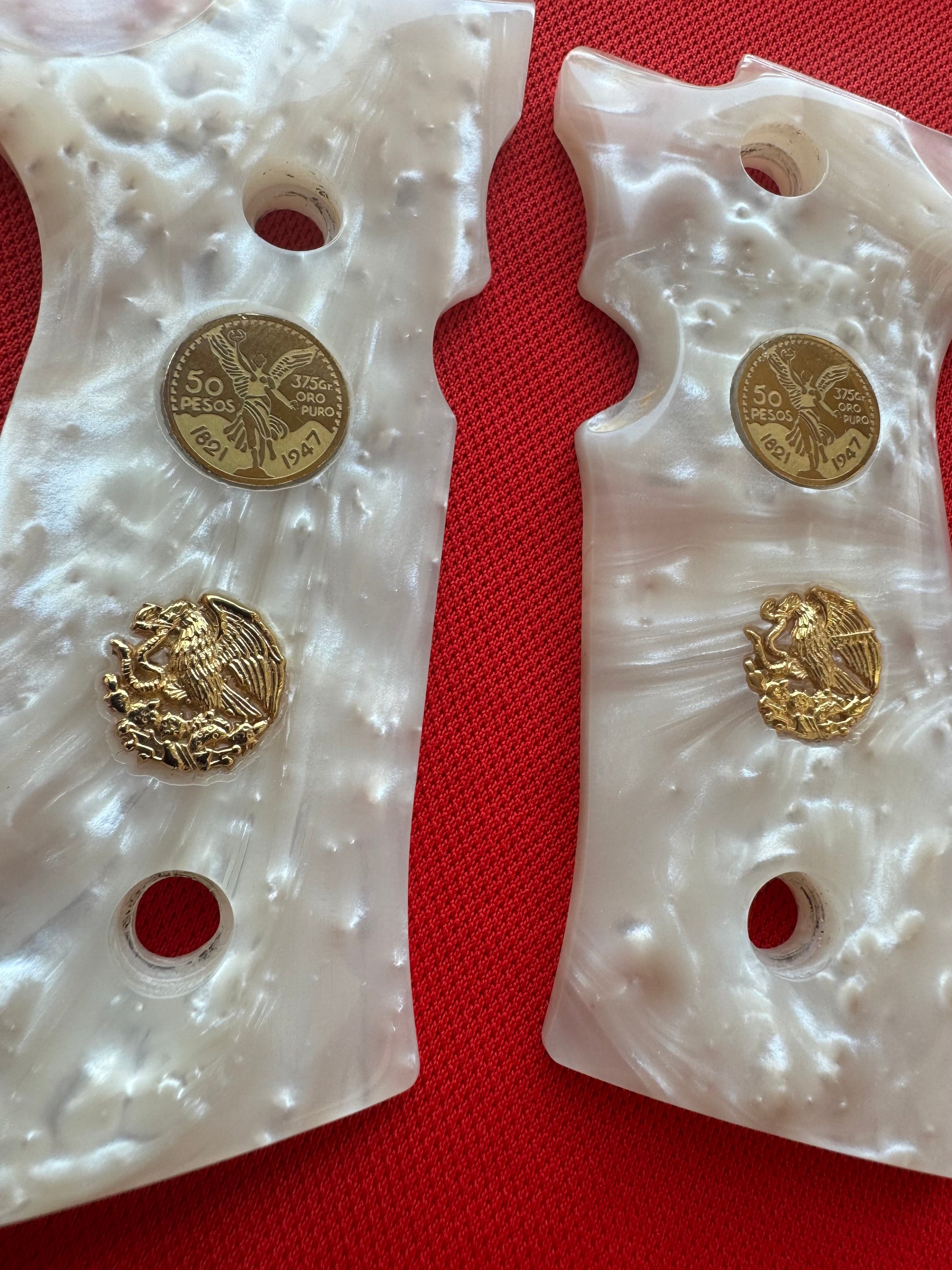 This Beretta Centenario grip is a unique addition to your handgun. The 14k gold fill and custom engraving add a touch of elegance to your weapon.