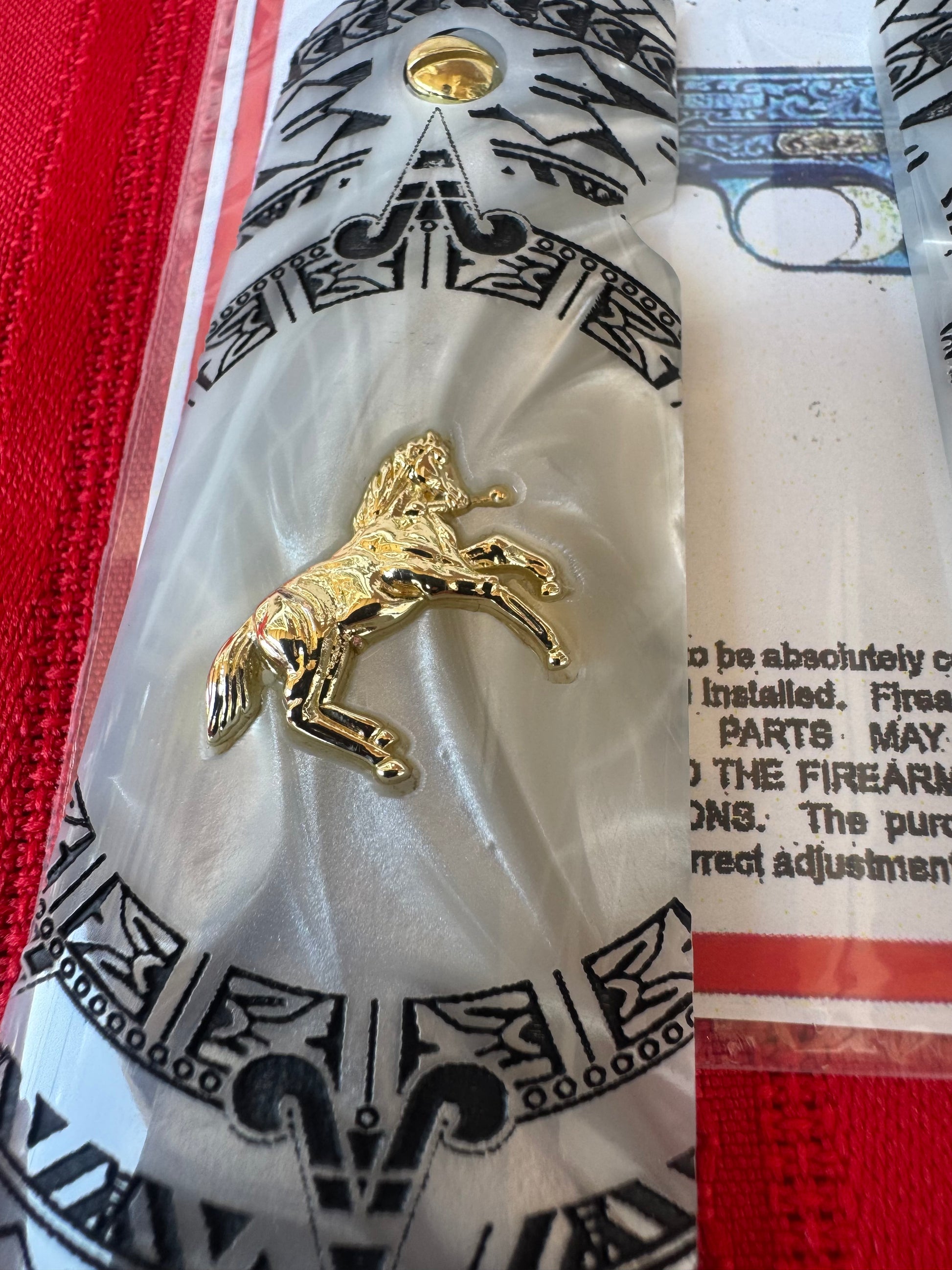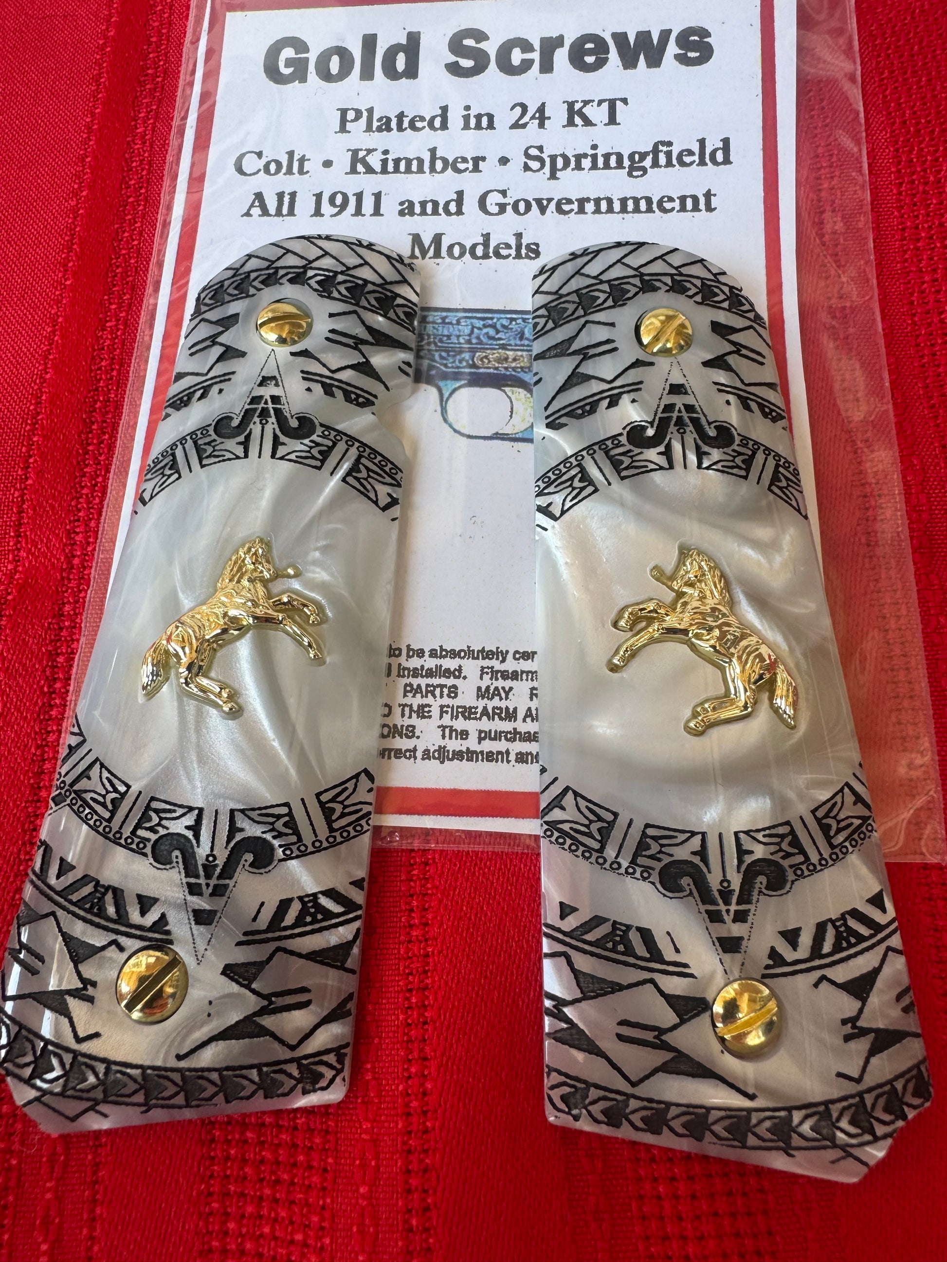 1911 Colt Gold-Plated Horse Grips – Pearl with Aztec Motif Engraving (.45 ACP / .38 Super) – Rare