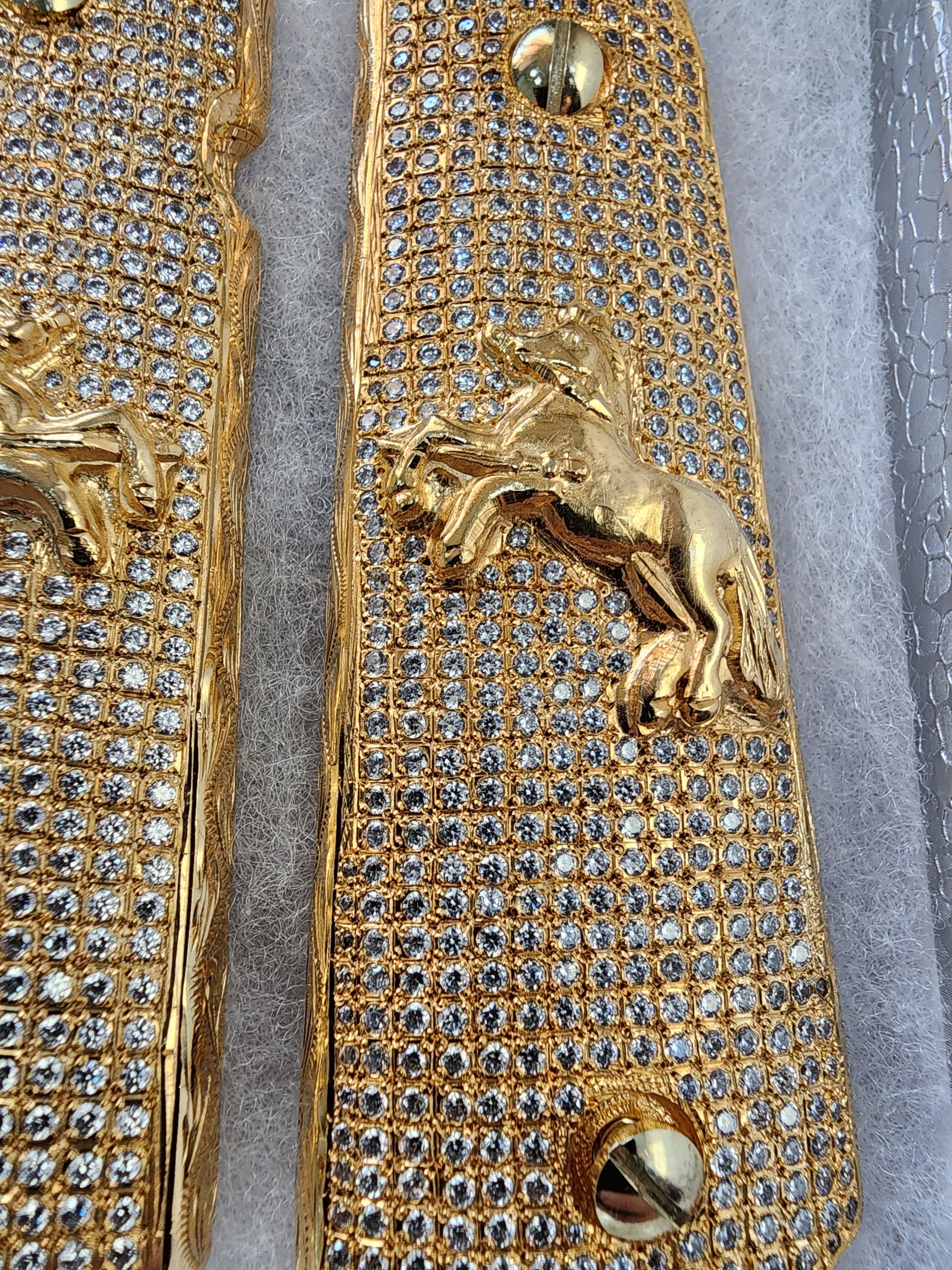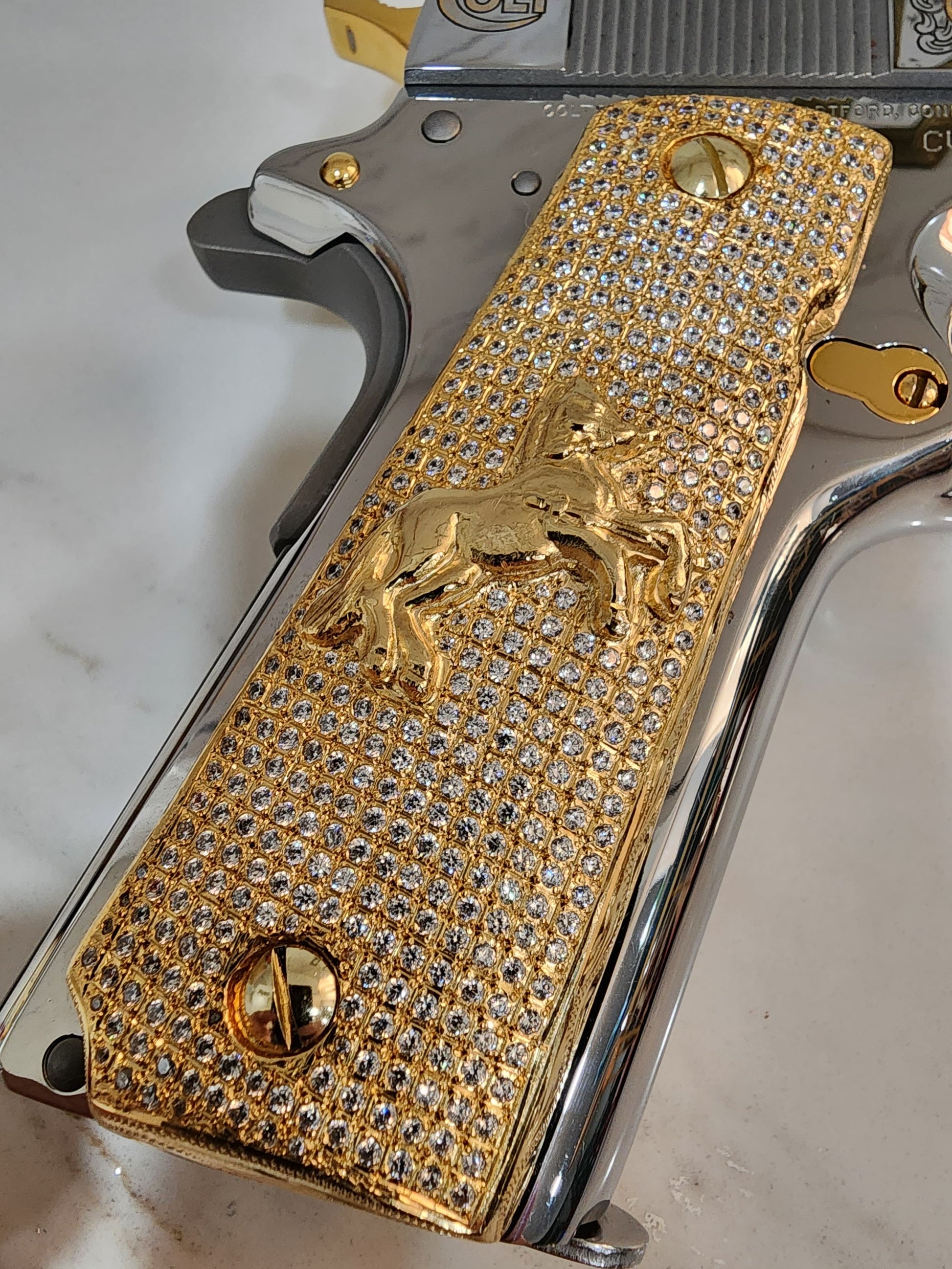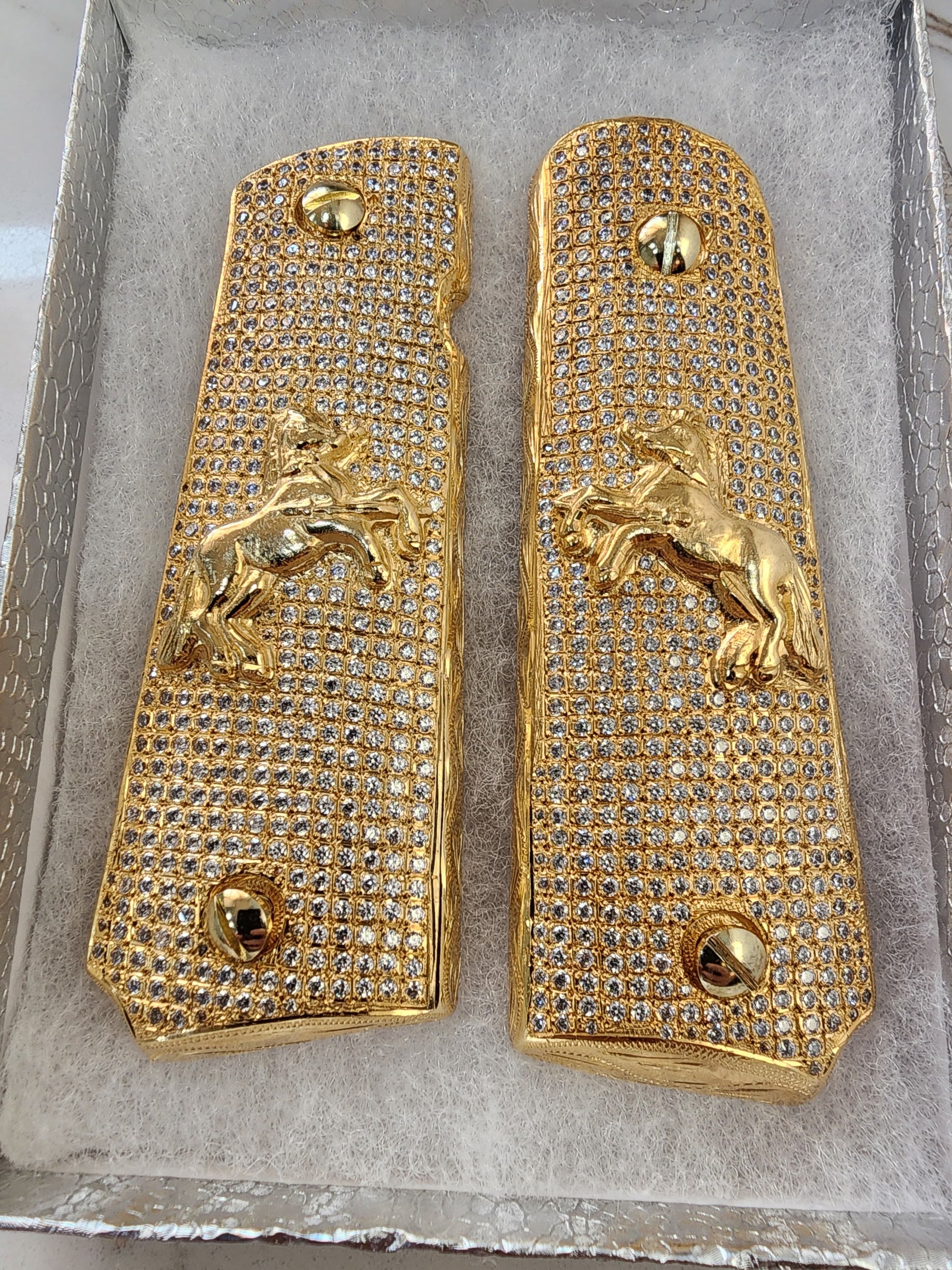 Elevate your 1911 with a stunning, jewelry-grade grip set featuring the rampart horse and shimmering cz stones.
