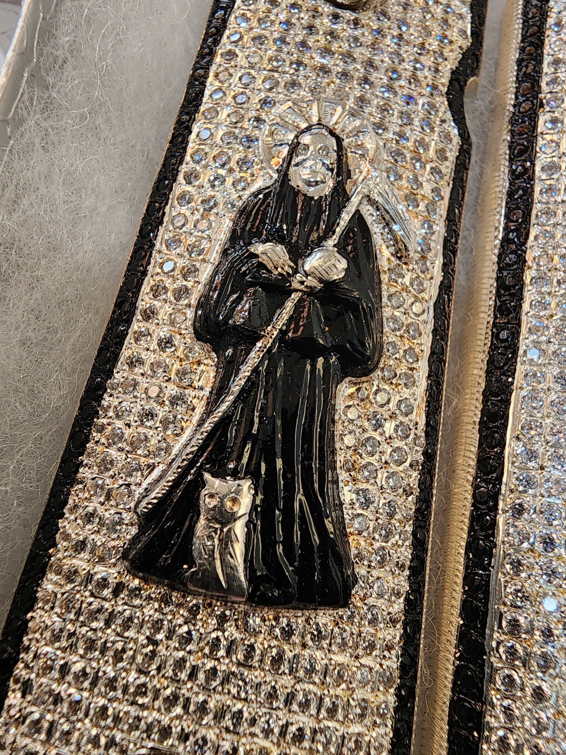 Elevate your 1911 with a stunning, jewelry-grade grip set featuring the santa muerte and shimmering cz stones.